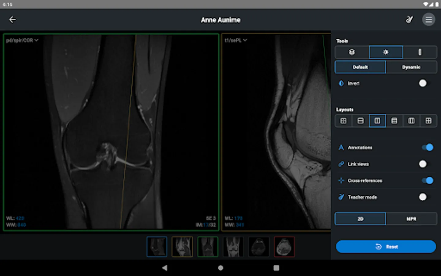 IDV supports DICOM files of all types (ultrasound, scanner, MRI, PET, etc.) and offers several fast and intuitive tools.
