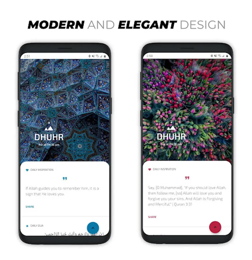 A modern and elegant Islamic app allows you to view Muslim prayer times and read and listen to the holy Quran verses in a beautiful layout. Get inspired and motivated by hand-picked quotes and Quranic verses. have access to dua in Arabic and English. Find the translation and meanings of the 99 names of Allah with the counter. Find the qibla direction with an animated qibla finder. View and set beautiful 4k Islamic wallpapers. Access quick salat times directly in the Notification bar and lock screen. Hijri (Islamic calendar) with special events.