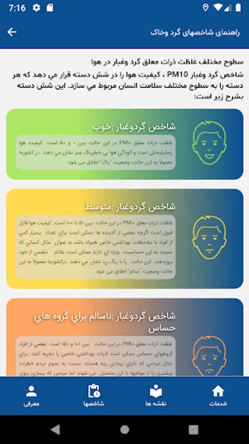 Considering the frequency of occurrence of dust phenomenon in the region, the focus of the mobile software of meteorological services of the National Research Institute of Meteorology and Atmospheric Sciences is based on the prediction of the dust phenomenon, especially the estimation of the concentration of suspended particles in the atmosphere.