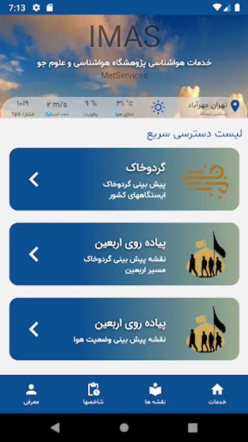 Among the meteorological services of "Arbaeen Weather" program, we can mention the current weather conditions, forecasting of atmospheric parameters and phenomena, as well as forecasting the concentration of suspended particles in the atmosphere.