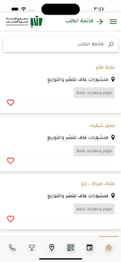 The Saudi International Book Fair 2022 application presents several services to visitors and Publishing Houses, including the searching capability for books, Publishing Houses, authors, and the creation of Favorite List Service for Publishing Houses and books. It also provides a map of the exhibition with a reliable navigation feature. In addition, it offers the possibility to purchase tickets for concerts and cultural events accompanying the exhibition.