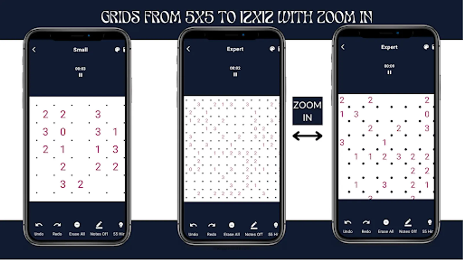 - Puzzles in square grid sizes 5x5, 6x6, 7x7, 8x8, 9x9, 10x10, 11x11 and 12x12