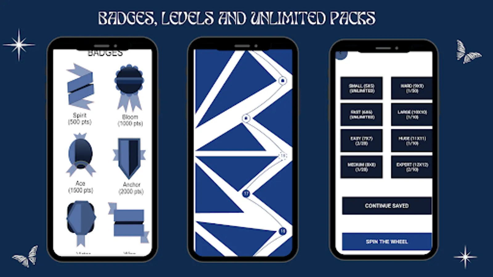 - Win badges (Spirit, Bloom, Ace, Anchor, Victor and Wise) by winning points playing each game - 10 points from small grid to 80 points from expert grid