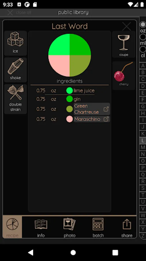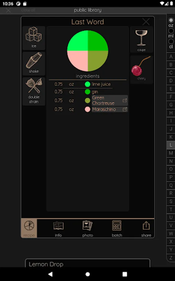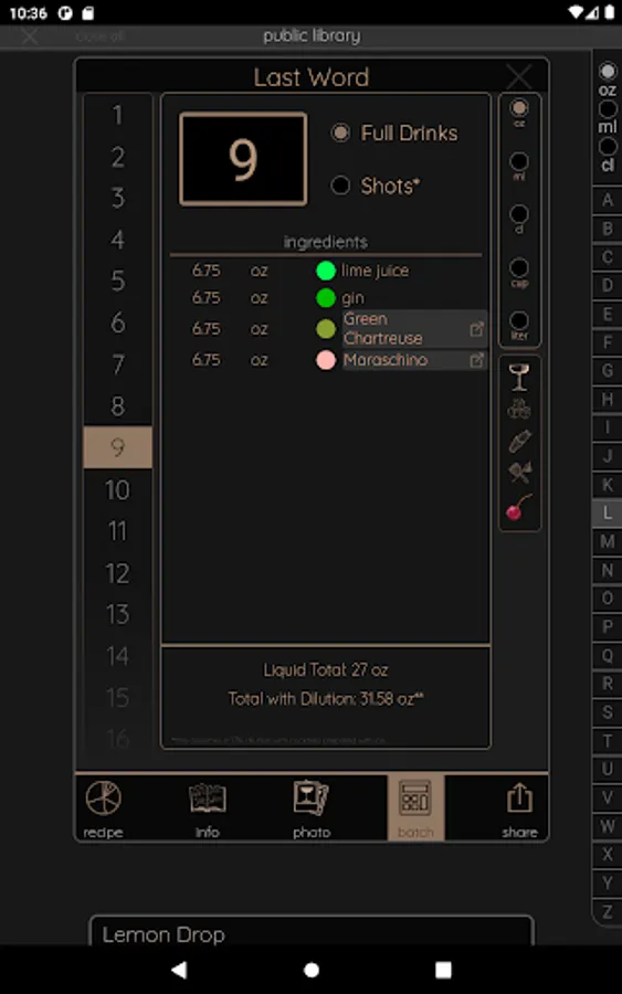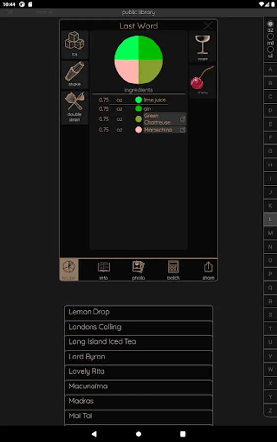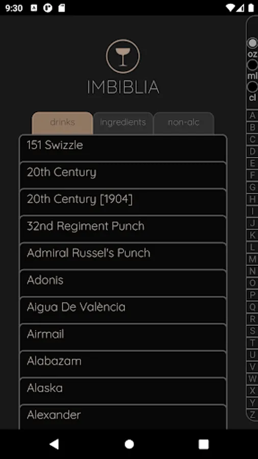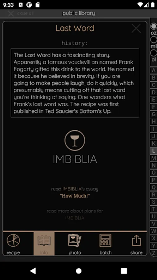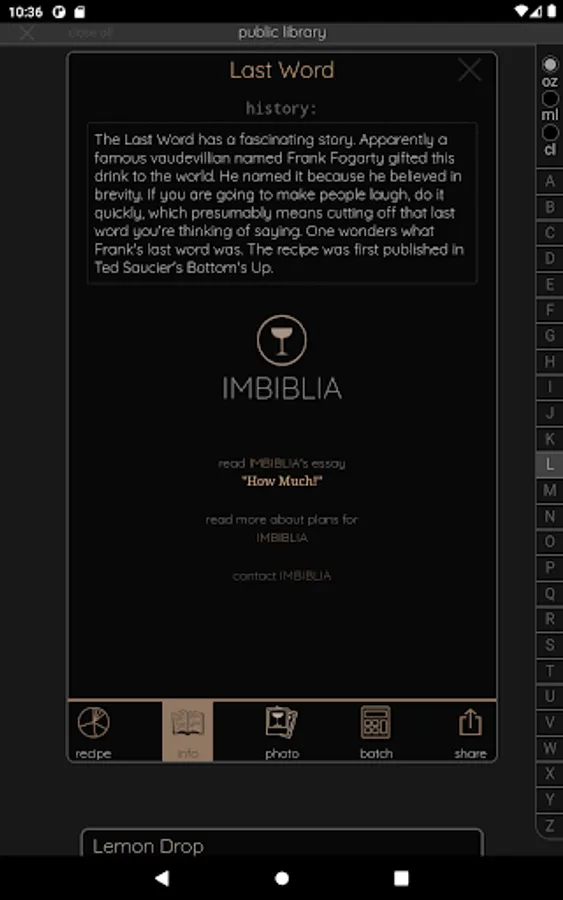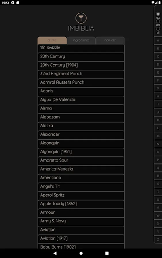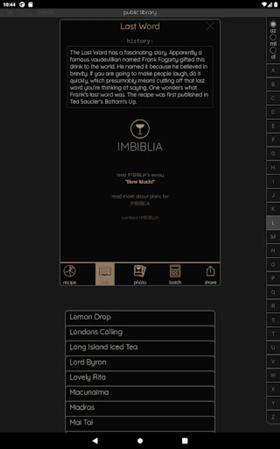 Imbiblia features over 400 drink recipes with a unique visual format, including historical recipes, modern additions, ingredient recipes, and non-alcoholic drink recipes. Imbiblia also has instant conversion and a batch calculator which can calculate any number of shots or full drinks for recipes. Recipes in-depth historical research and notes on methods.