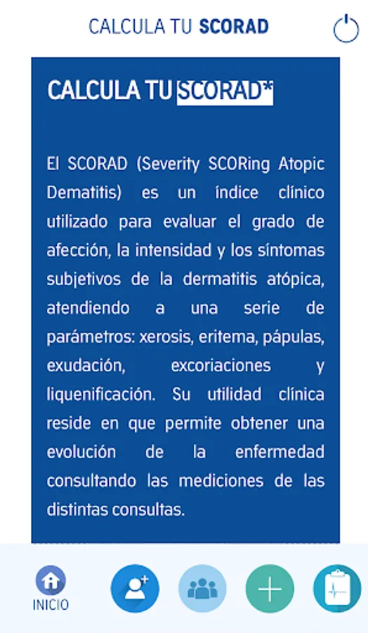 Leo Pharma presents a simple tool that will allow you to quantify the degree of affection, save the measurements obtained in each of the consultations and consult the evolution of the pathology of your patients. The SCORADs of patients younger than 2 years of age will be registered automatically.