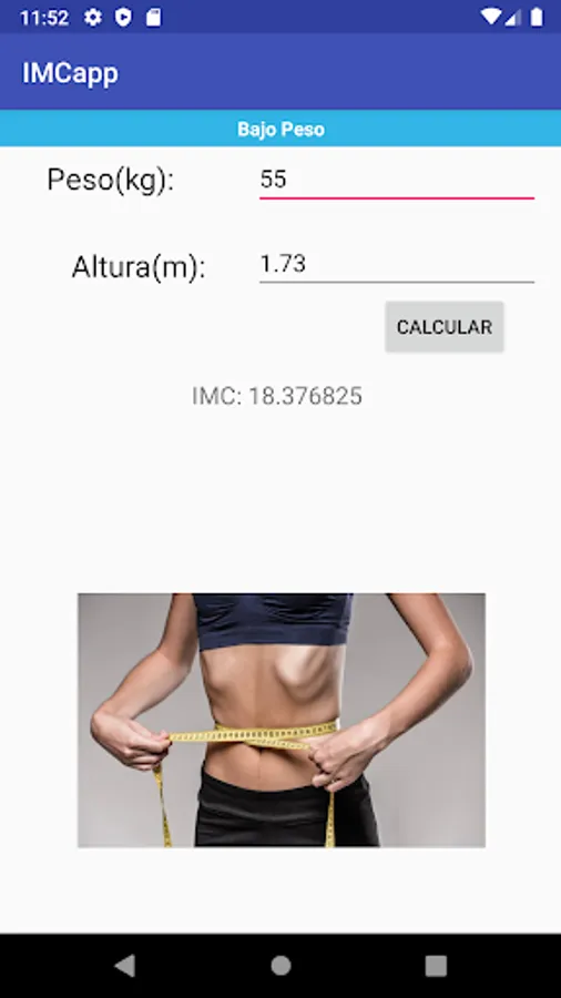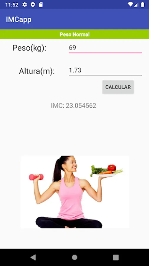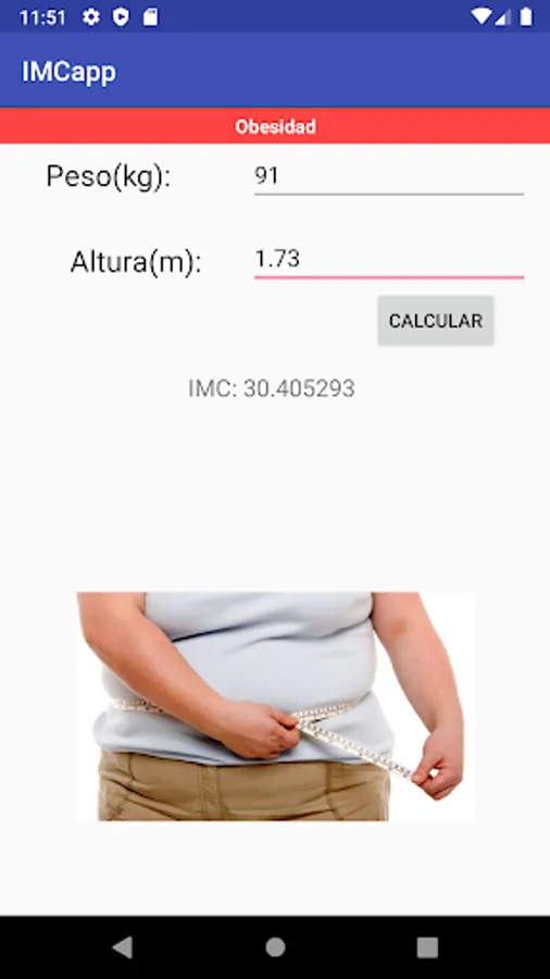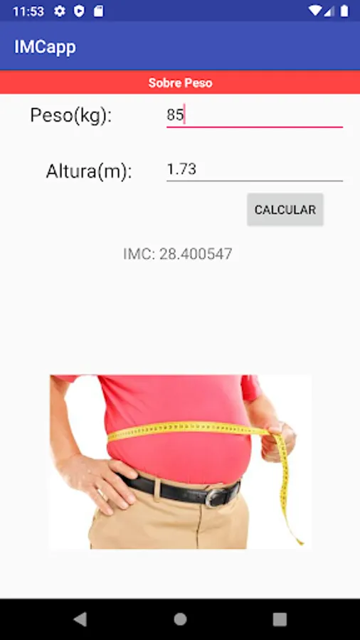 Android application that is responsible for calculating the body mass index and tells us our state based on it. -Use of the Picasso and Crouton libraries to manage images and notifications respectively.
