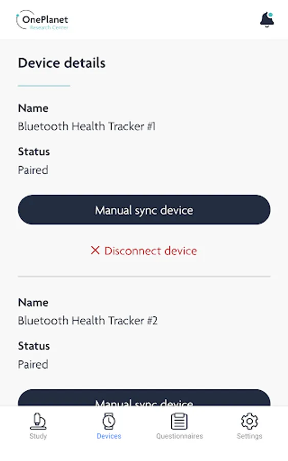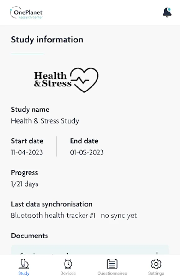 The OnePlanet Research app is developed for supporting both public and private research studies which are conducted by OnePlanet Research Center (sponsored by imec). Study participants can log-in to enter a study with details they have gotten from the researchers. The OnePlanet Research app will transfer data from wearables (Garmin and/or imec’s Chill+) to the imec Cloud, provide information regarding the study, allow participants to take part in questionnaires, and display messages from the researchers. The data will be used in the associated research study.
