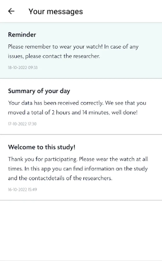 If you have noticed any bugs in the app, please contact us at: appsupport@imec.be or the researchers. If there are any questions regarding a study, please contact the researchers with the details provided to you in previous communication with OnePlanet Research Center.