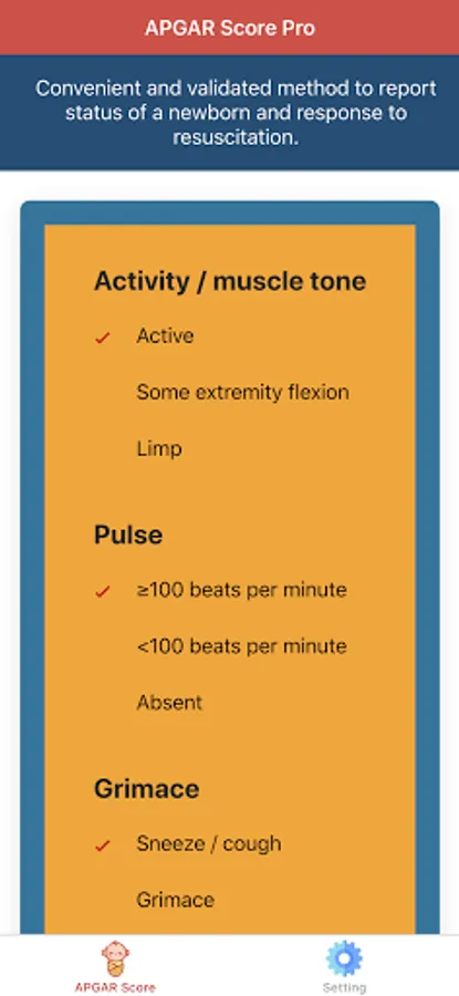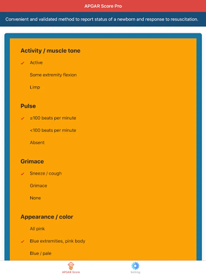 The APGAR score is a simple method of quickly assessing the health and vital signs of newborn baby after delivery. The five criteria assessed in APGAR score are: A - Appearance (Skin Color), P - Pulse (heart rate), G - Grimace (Reflex Irritability / Response), A - Activity (Muscle Tone), R - Respiration (Breathing Ability). "APGAR Score Pro: Pediatric Newborn Assessment" apps will help health practitioners to quickly determine the APGAR score of newborn baby.