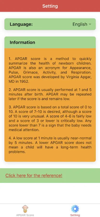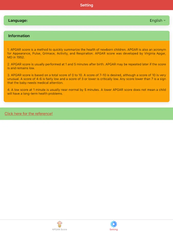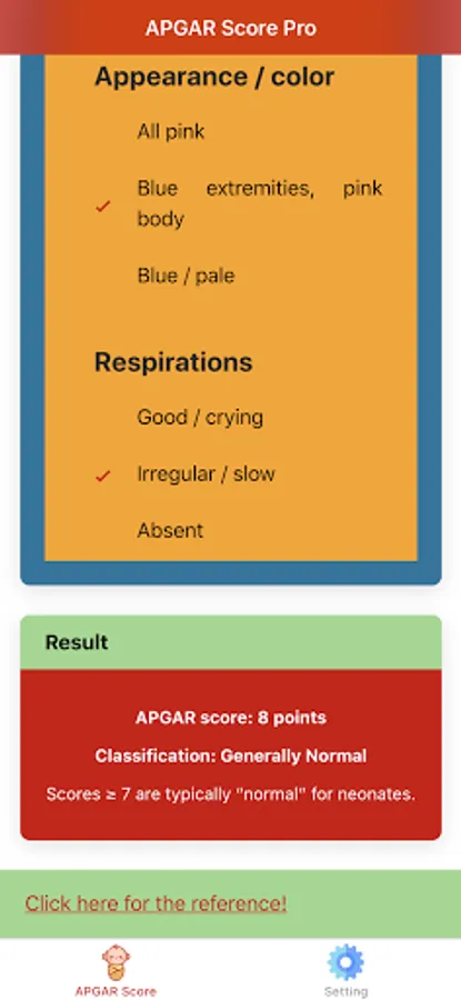 APGAR score is usually evaluated at 1 and 5 minutes after birth. In "APGAR Score Pro: Pediatric Newborn Assessment" apps, user can simply choose between several selections to calculate the APGAR score. "APGAR Score Pro: Pediatric Newborn Assessment" apps will also give the interpretation of the APGAR score. A score of 7-10 is desired (considered normal), 4-6 is fairly low, and 3 or lower is critically low. Any score lower than 7 is a sign that a baby needs medical attention. "APGAR Score Pro: Pediatric Newborn Assessment" also provide comprehensive information about the APGAR score.