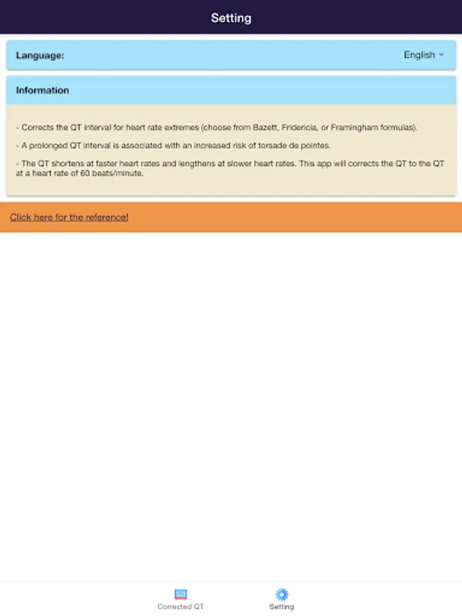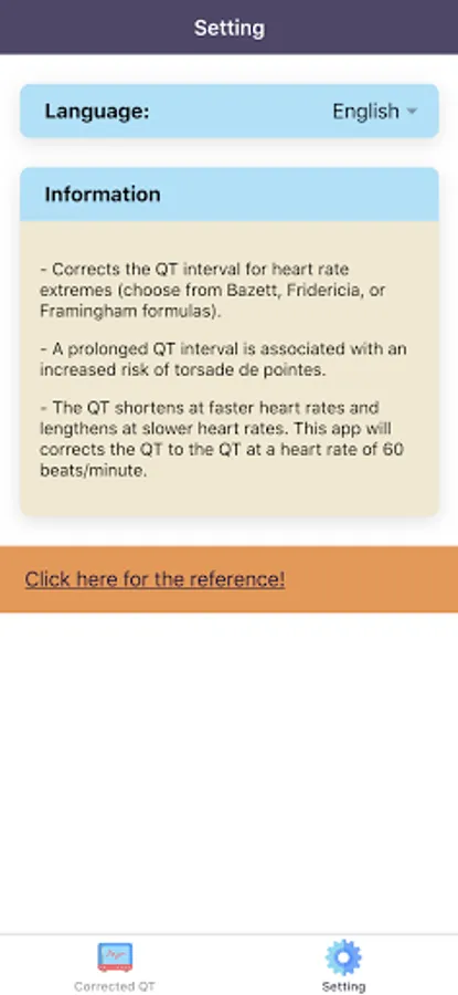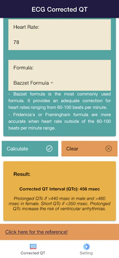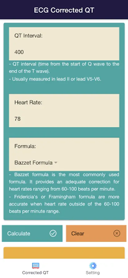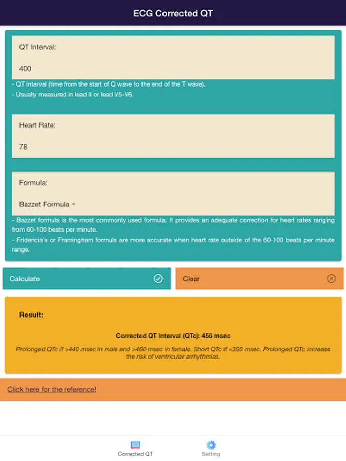The QT interval is affected by heart rates, so we need to calculate the corrected QT interval (QTc). The corrected QT interval (QTc) will estimate the QT interval at a heart rate of 60 beats per minute. Prolonged corrected QT interval (QTc) is associated with ventricular arrhythmias, especially Torsades de Pointes. "Electrocardiogram (ECG) Rhythm App: Corrected QT" app is a practical medical calculator to calculate the corrected QT interval (QTc). In "Electrocardiogram (ECG) Rhythm App: Corrected QT", the user need to input the QT interval (in millisecond) and heart rate (in beats per minute) to calculate the corrected QT interval (QTc). "Electrocardiogram (ECG) Rhythm App: Corrected QT" have three available formulas, namely Bazzet, Fredericia, and Framingham.