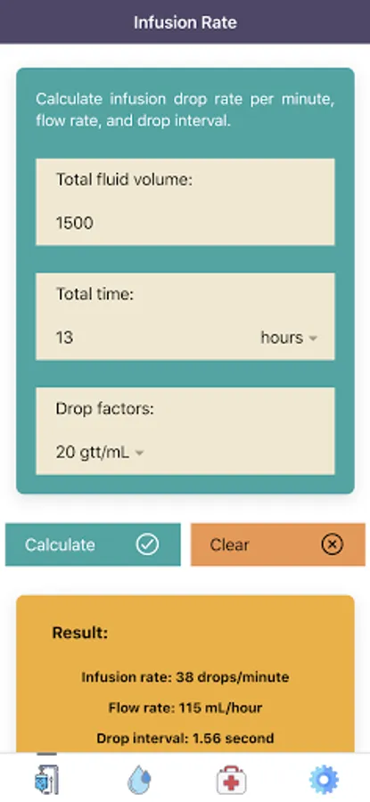 In "Infusion Rate" feature, the user can calculate the drop rate for intravenous infusion easily and accurately. This infusion calculators will show drops rate per minute that will be shown with flow rate (mL/hour) and drop interval (second). There are several available drop factors, such as 10 gtt/mL, 15 gtt/mL, and 20 gtt/mL.