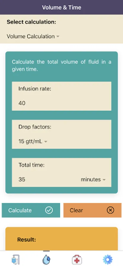 In "Volume & Time" feature, the user can switch between "Volume Calculation” or "Time Calculation". The "Volume Calculation" allows the user to calculate the total volume of intravenous fluids that will be given in a certain time. While the "Time Calculation" allows the user to calculate the amount of time needed to administer the given volume of fluids, medications, drugs, or dosages.
