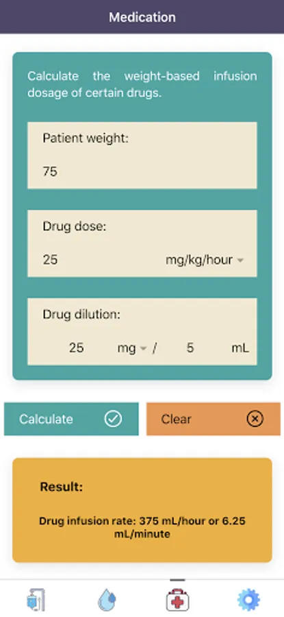 "IV Infusion Calculator: Dosage, Drug, & Drip Rate" also has "Medication Calculator" feature. This feature allows the user to calculate the weight-based infusion dosage of certain medication or drugs. This feature is useful for pediatric dosage calculator. There are several available drug's dosage units that are most commonly used. The drug or medication intravenous infusion rate is then shown in mL/minute and mL/hour.