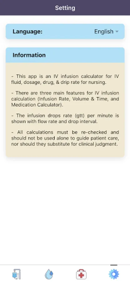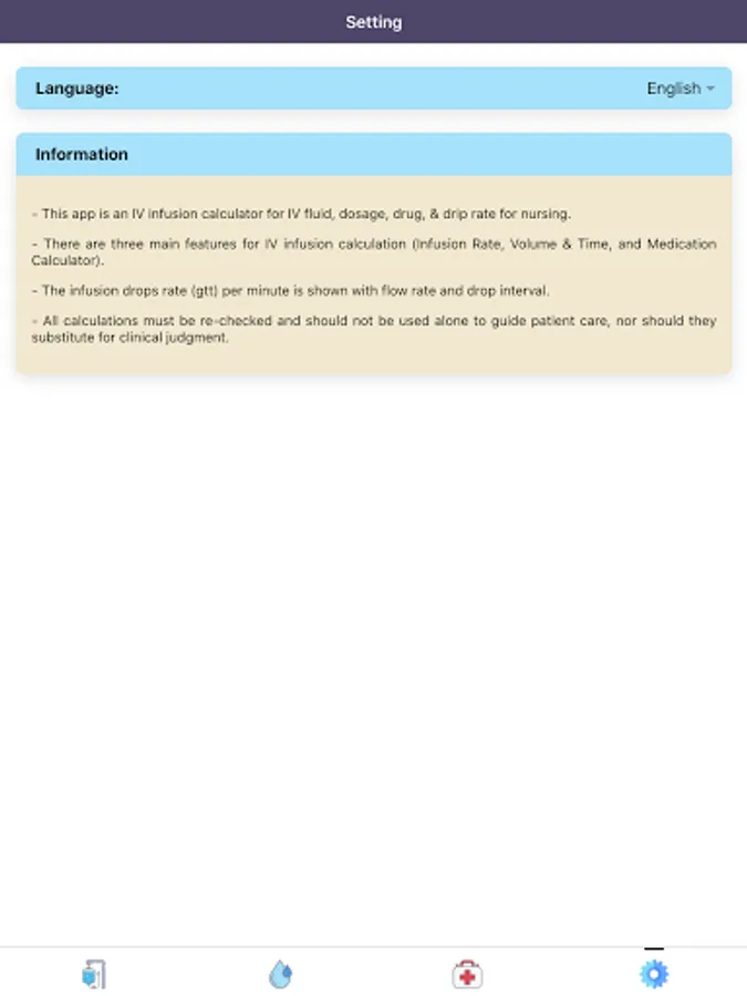 Disclaimer: all calculations must be re-checked and should not be used alone to guide patient care, nor should they substitute for clinical judgment. Calculations in this "IV Infusion Calculator: Dosage, Drug, & Drip Rate" app might be different with your local practice. Consult to expert doctor whenever necessary.