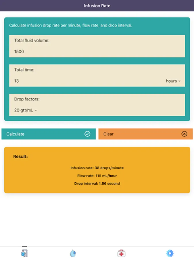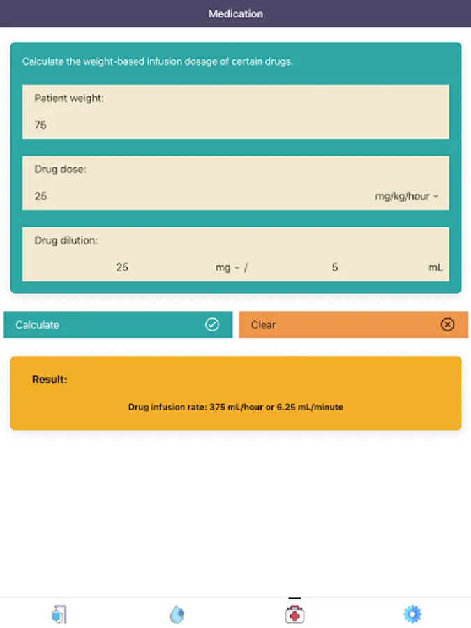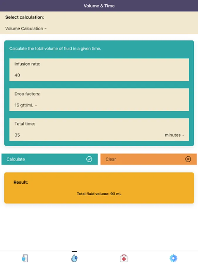 🔸 There are three main features for IV infusion calculation (Infusion Rate, Volume & Time, and Medication Calculator).
