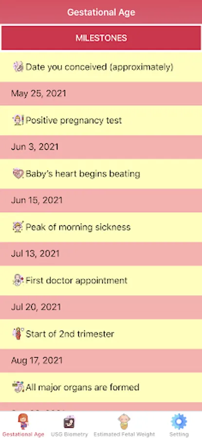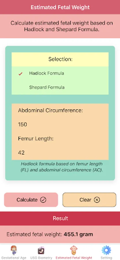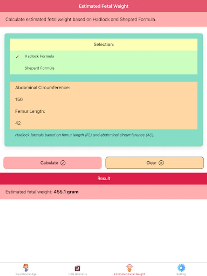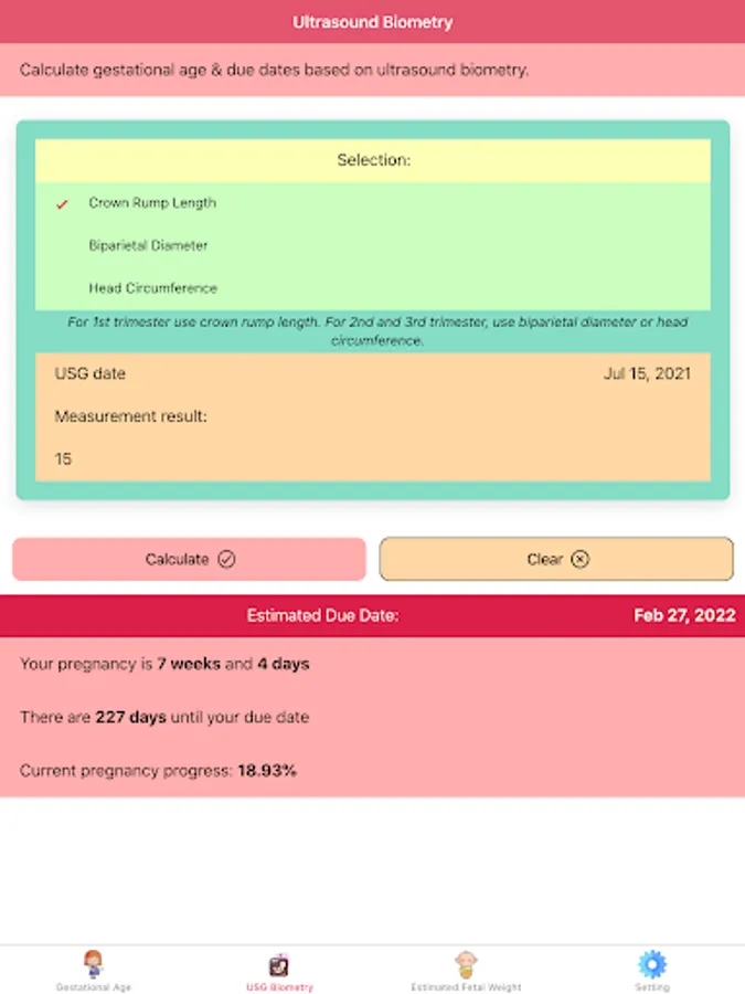 "Pregnancy Calculator Pro: Maternity & Motherhood" will calculate gestational age and estimated date of delivery (EDD) / due date based on last menstrual period (LMP). The users also could use several ultrasonography (USG) biometrics to calculate gestational age and estimated date of delivery (EDD). Ultrasonography (USG) biometrics used are crown-rump length (CRL), biparietal diameter (BPD), and femur length (FL). "Pregnancy Calculator Pro: Maternity & Motherhood" also has a feature to estimate fetal weight with Hadlock or Shepard formula.