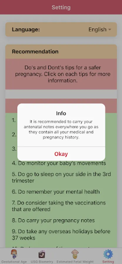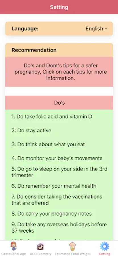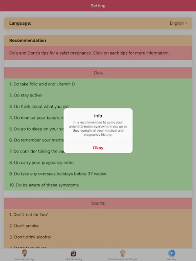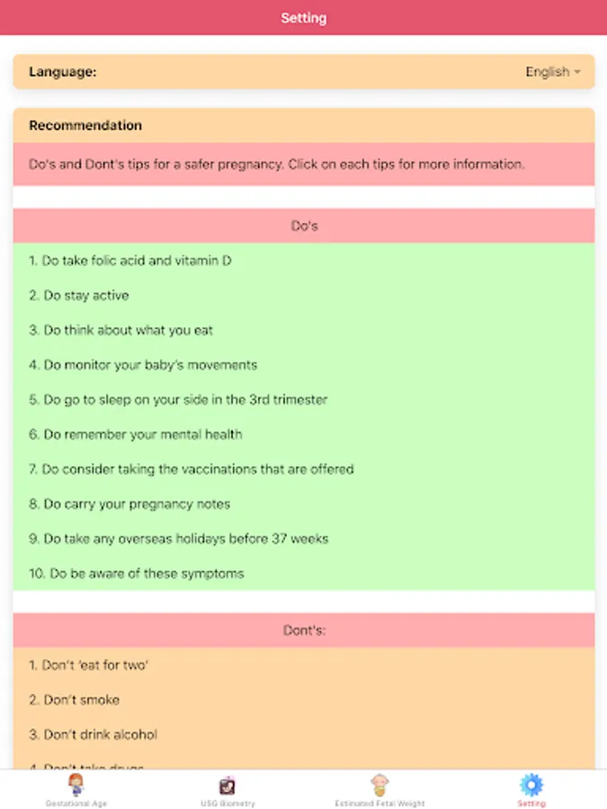 "Pregnancy Calculator Pro: Maternity & Motherhood" also provides useful recommendations and tips for pregnancy. Pregnant women could find recommended antenatal visitation schedule to the obstetrician, immunisation schedule, and weight gain during pregnancy. Pregnant woman also could find recommended healthy diet, vitamin, minerals, and exercise during pregnancy. Because of these, "Pregnancy Calculator Pro: Maternity & Motherhood" is not just recommended for healthcare practitioner but also for all pregnant women widely.