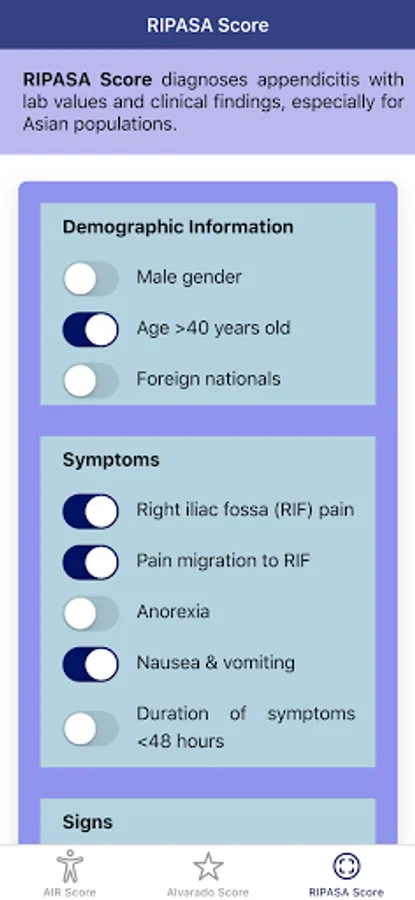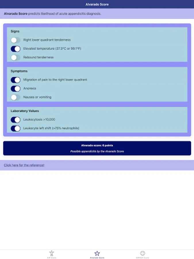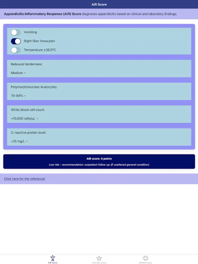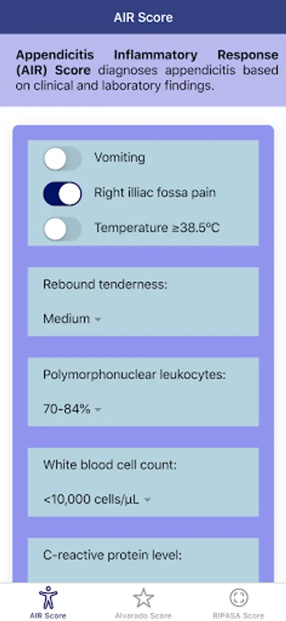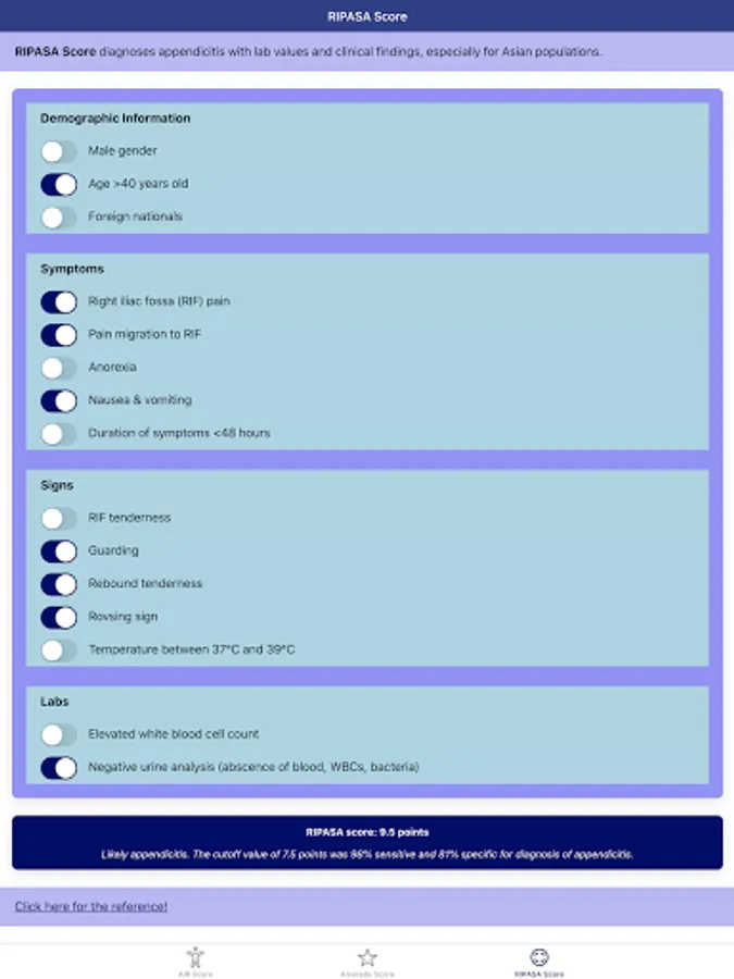 Appendicitis inflammatory response (AIR) score has been used in both paediatric and adult patients with large external validation study. Diagnosis of acute appendicitis with appendicitis inflammatory response (AIR) score is also said to be more superior compared to Alvarado score. Alvarado score also predicts likelihood of appendicitis diagnosis. The Alvarado Score was initially described in 1986 by Dr. Alfredo Alvarado in a retrospective single centre study in Philadelphia. It is one of the most commonly used formula to diagnose appendicitis nowadays. While RIPASA score is similar to both AIR score and Alvarado score. It typically provides a quantitive value for a clinician's clinical gestalt of appendicitis. It has been most widely studied in Asian populations (Singapore, India) and less so in Western populations. In "Pocket Appendicitis Score - AIR, Alvarado, RIPASA Score" app, you can easily predict appendicitis with AIR score, Alvarado score, and RIPASA score.