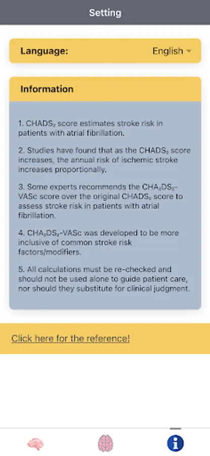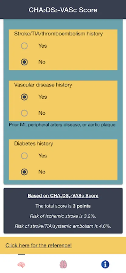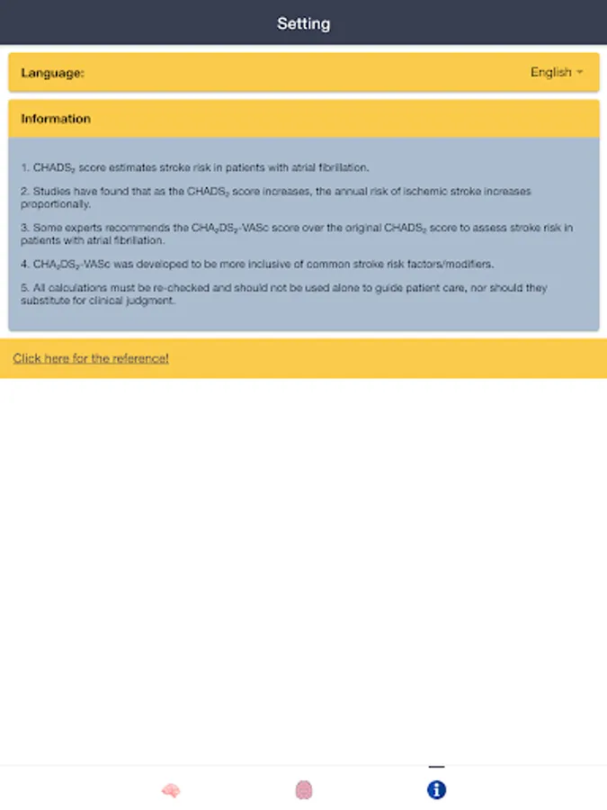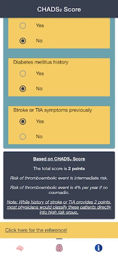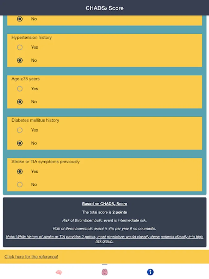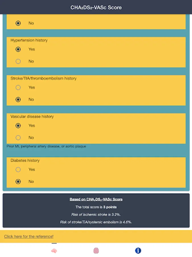 Disclaimer: all calculations must be re-checked and should not be used alone to guide patient care, nor should they substitute for clinical judgment. Calculations in this "AF Stroke Risk - Atrial Fibrillation Evaluation" app might be different with your local practice. Consult to expert doctor whenever necessary.