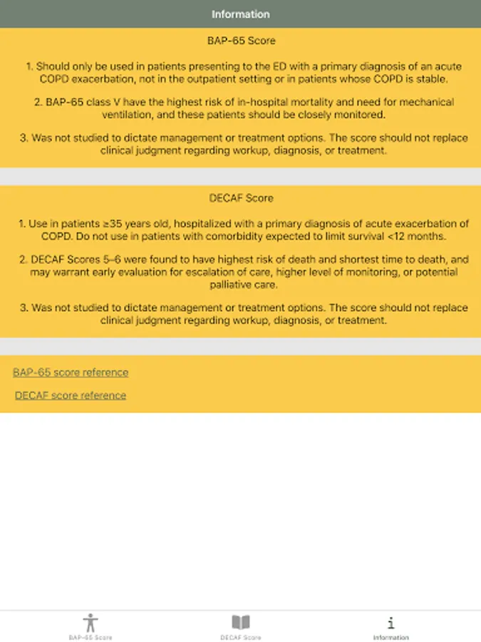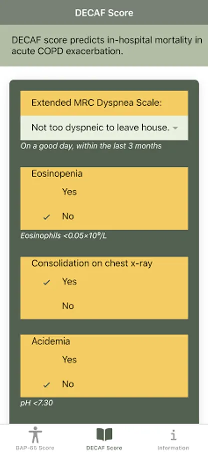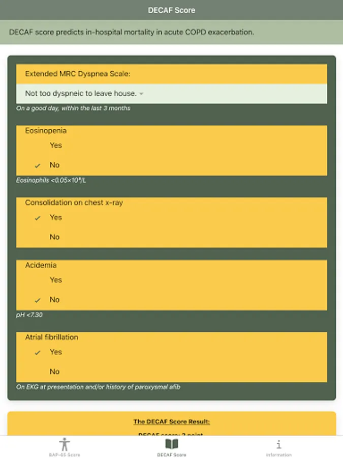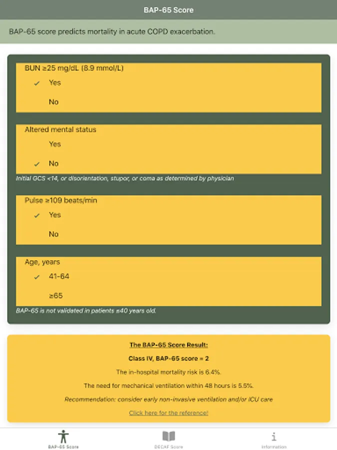 Disclaimer: all calculations must be re-checked and should not be used alone to guide patient care, nor should they substitute for clinical judgment. Calculations in this "Respiratory COPD Exacerbation: BAP65 & DECAF Score" app might be different with your local practice. Consult to expert doctor whenever necessary.