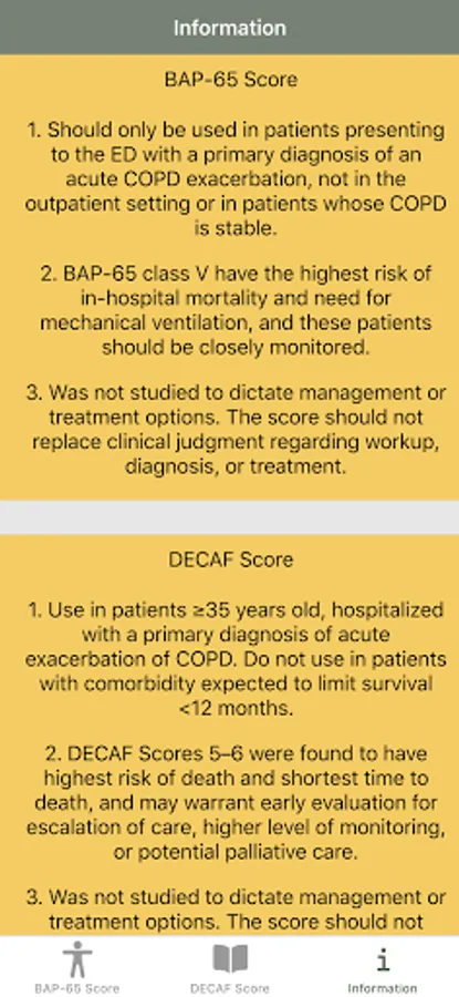 "Respiratory COPD Exacerbation: BAP65 & DECAF Score" is a mobile app designed to help with health practitioner in assessing the severity and predicting the outcome in acute exacerbation of chronic obstructive pulmonary disease (COPD) by using BAP-65 and DECAF Score. Chronic obstructive pulmonary disease (COPD) is defined as a common preventable and treatable disease, characterised by persistent airflow limitation that is usually progressive and associated with an enhanced chronic inflammatory response in the airways and the lung to noxious particles or gases. Exacerbations and comorbidities contribute to the overall severity in individual patients.
