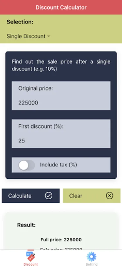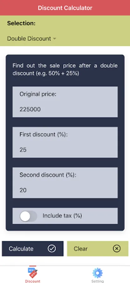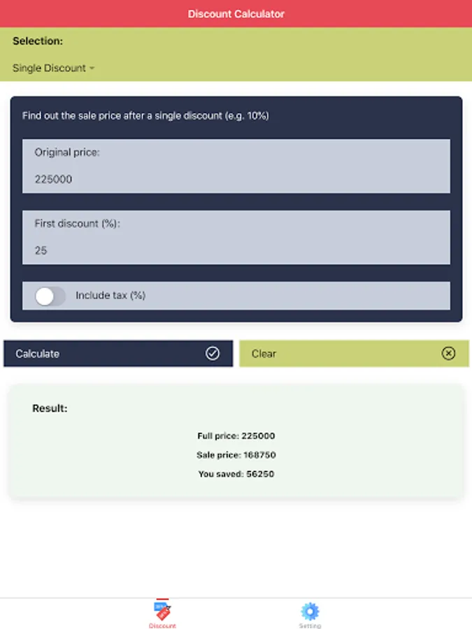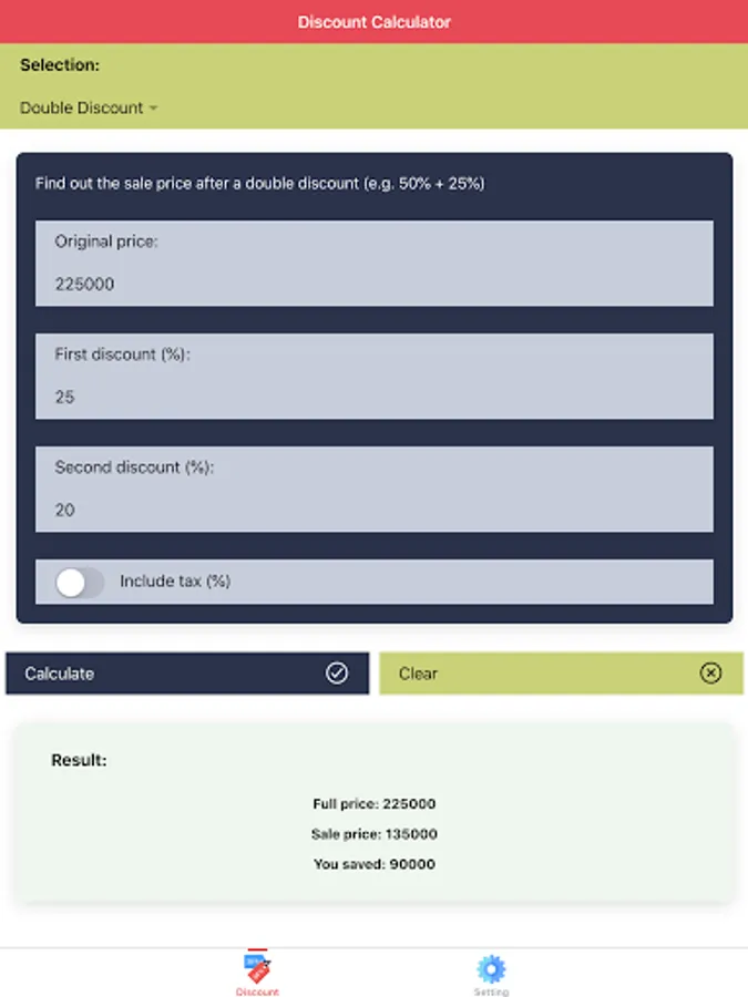 "Shopping Calculator - Percent Off & Sales Tax" is an app that allows you to find the reduced price of a product and the amount of money you save. As a shopper, you can also use "Shopping Calculator - Percent Off & Sales Tax" app as a sale price calculator to help you negotiate the price. Depending on your needs, our "Shopping Calculator - Percent Off & Sales Tax" app goes well with double discount calculator. "Shopping Calculator - Percent Off & Sales Tax" app is the ideal shopping companion.