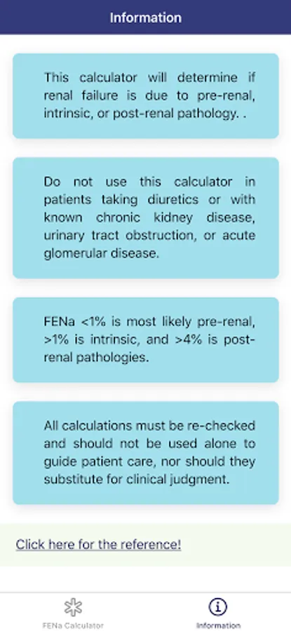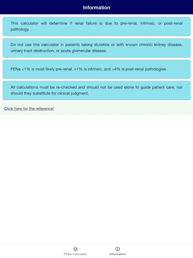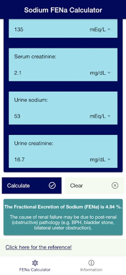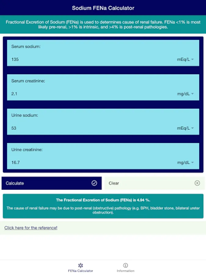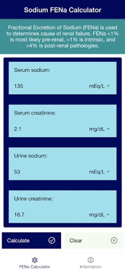 Disclaimer: all calculations must be re-checked and should not be used alone to guide patient care, nor should they substitute for clinical judgment. Calculations in "Sodium FENa Calculator - Acute Kidney Injury" app might be different with your local practice. Consult to expert doctor whenever necessary.
