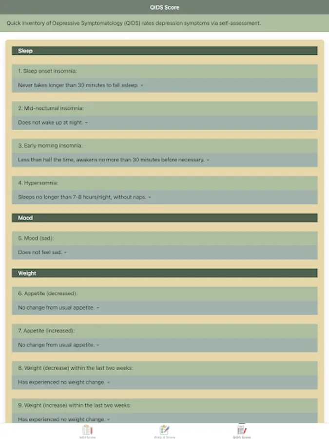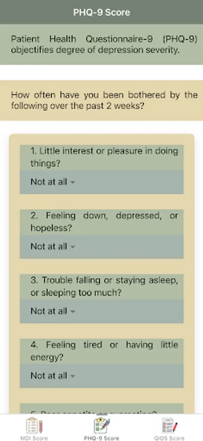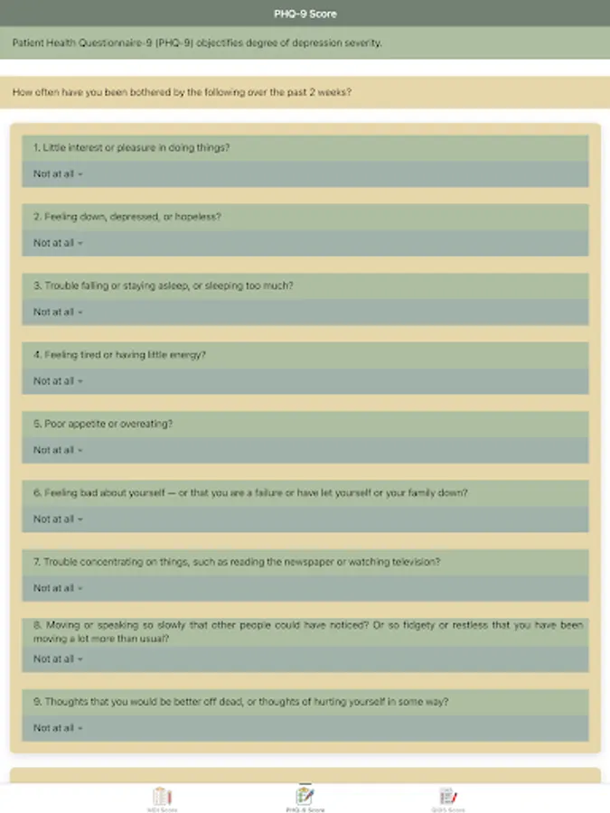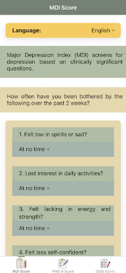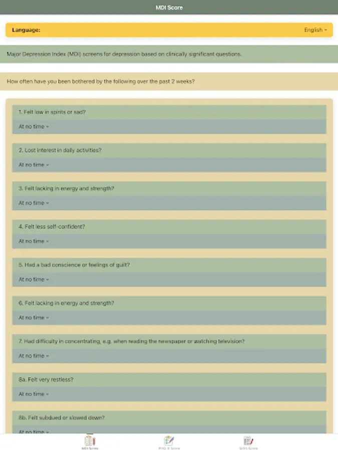 “Pocket Depression Test - Clinical Depression” is an app designed for screening and diagnosis of depression based on several validated tests or questions. Depression is a common and serious medical illness that negatively affects how you feel, the way you think, and how you act. It may be described as feelings of sadness, loss, or anger. Early screening of depression and classification of its severity are helpful in determining appropriate action to help. people with depression. In “Pocket Depression Test - Clinical Depression” app, there are three main tests available, namely: (a) Major Depression Index (MDI); (b) Patient Health Questionnaire-9 (PHQ-9); (c) Quick Inventory of Depressive Symptomatology (QIDS). These are the most commonly used test by medical practitioner to screen and classify degree of depression severity.