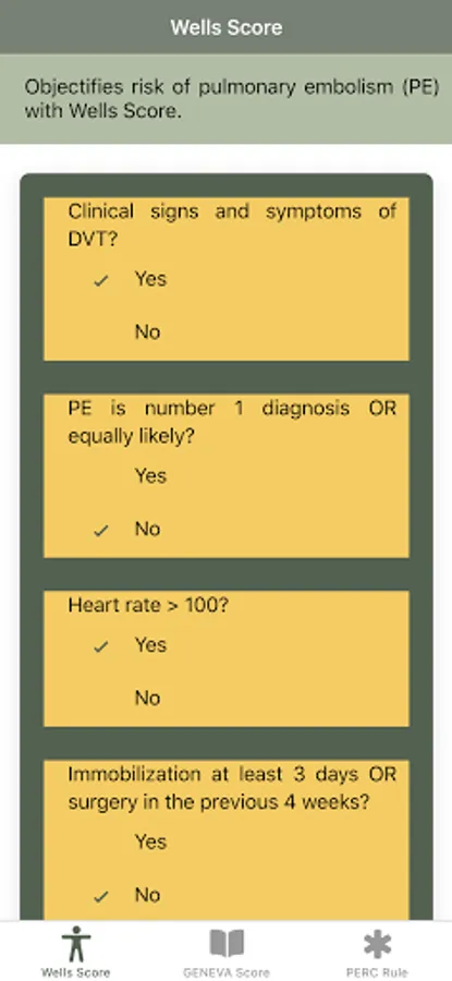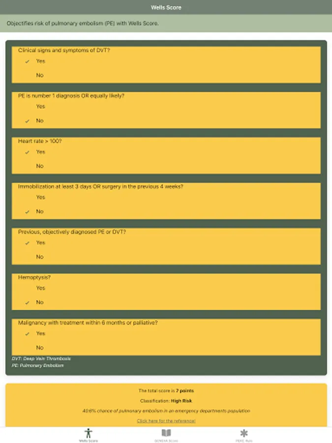 "Pulmonary Embolism Score: Wells, GENEVA, PERC rule" is a mobile app designed to help health practitioner to determine the risk of pulmonary embolism by using the Wells criteria or Wells score, GENEVA score, and PERC rule. The Wells criteria for pulmonary embolism is a risk stratification score and clinical decision rule to estimate the probability for acute pulmonary embolism in patients in which history and examination suggest acute pulmonary embolism is a diagnostic possibility. As with all clinical decision aids, the physician must first have a suspicion of the diagnosis before attempting to apply the Wells criteria. History taking and exam should always be performed prior to using the "Pulmonary Embolism Score: Wells, GENEVA, PERC rule" app.