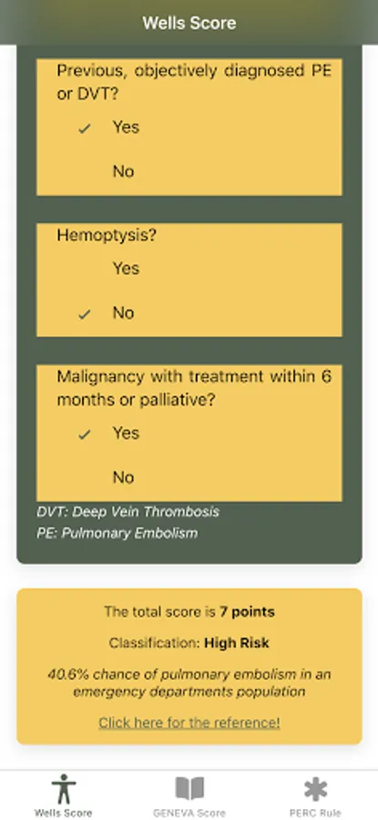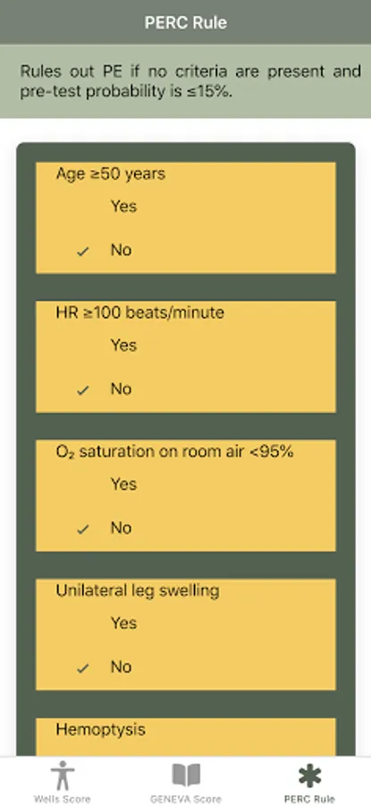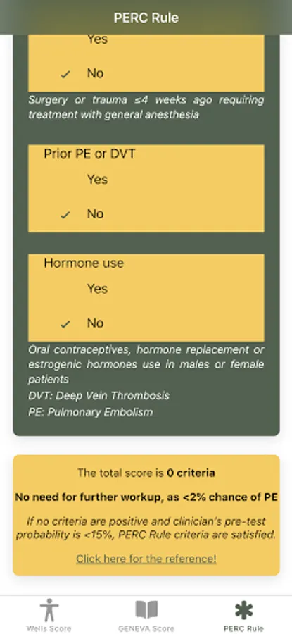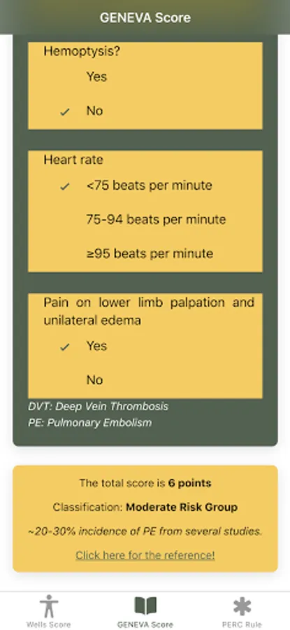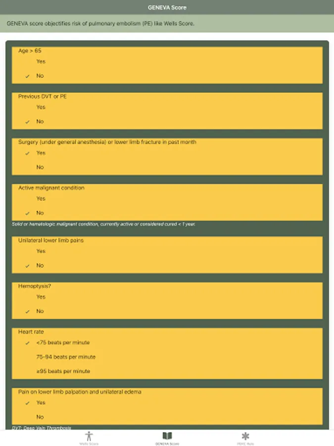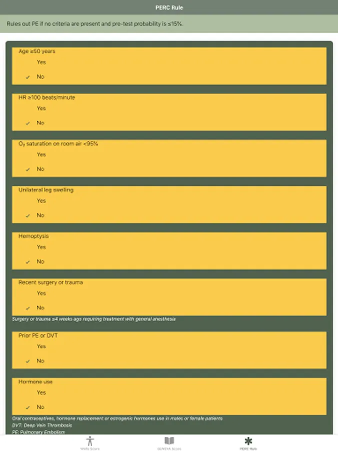 Disclaimer: All calculations must be re-checked and should not be used alone to guide patient care, nor should they substitute for clinical judgment. Calculations in this "Pulmonary Embolism Score: Wells, GENEVA, PERC rule" app might be different from your local practice. Consult with an expert doctor whenever necessary.