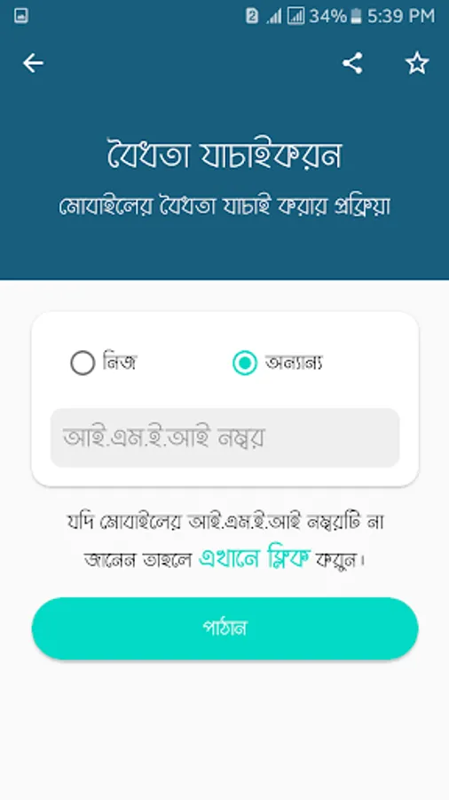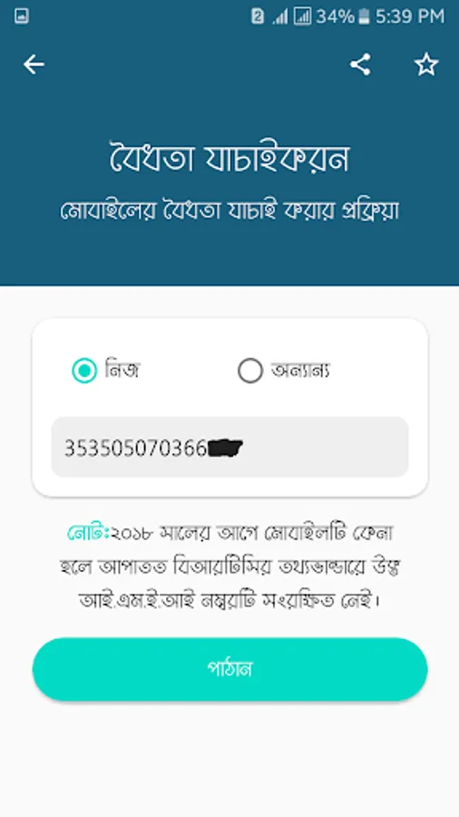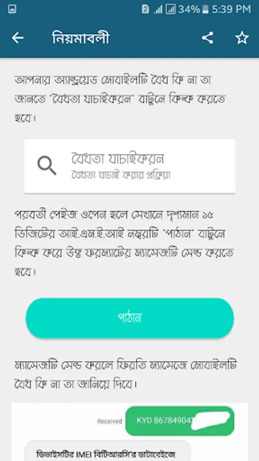 মোবাইলের বৈধতা যাচাইকারী is a very good and handy app that helps to find out whether a handset is real or fake by cross-matching it with the IMEI database. Using this Mobile Verification tool, the user only needs to send a text to a certain number. The return text will confirm the set’s identity. This app supports all sim operators in BD like grameenphone (gp), Banglalink, Robi, Airtel, Teletalk for sending SMS.