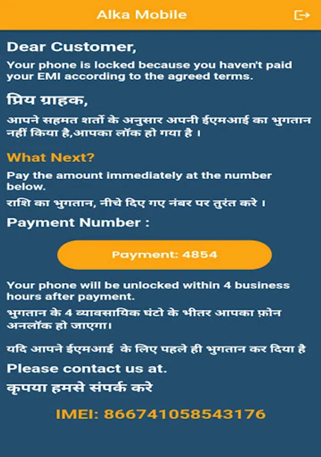 this app checks shop details agains imei no who is purchased from our shop or portal only . and provide contact details and emi details to the customer
