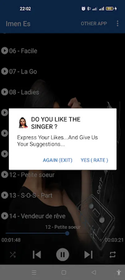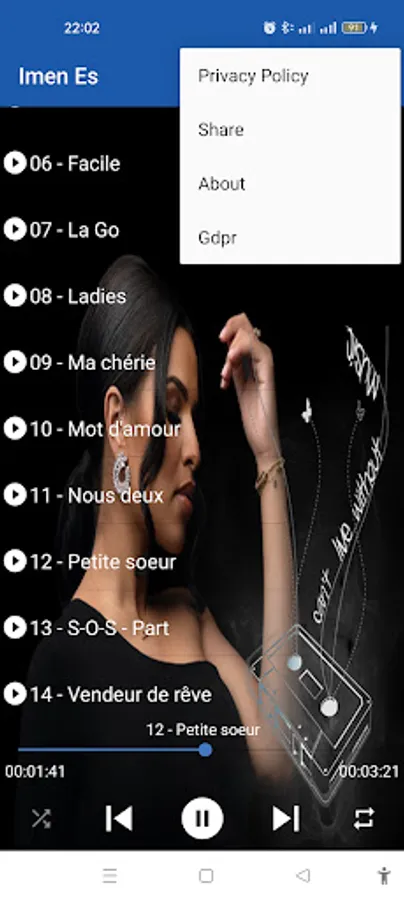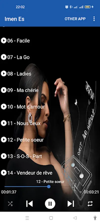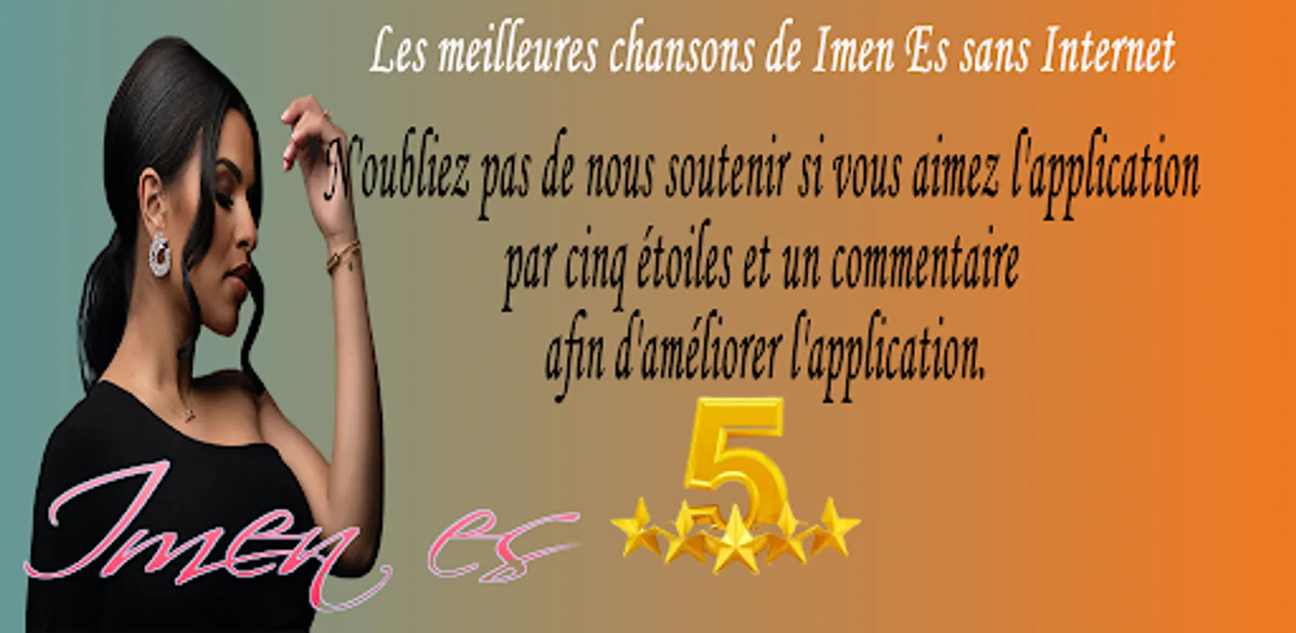 In this application you will find the best songs and updates of Imen Es. Download the free app on your smartphones for an unlimited time and enjoy the best songs with high quality sound and without internet.