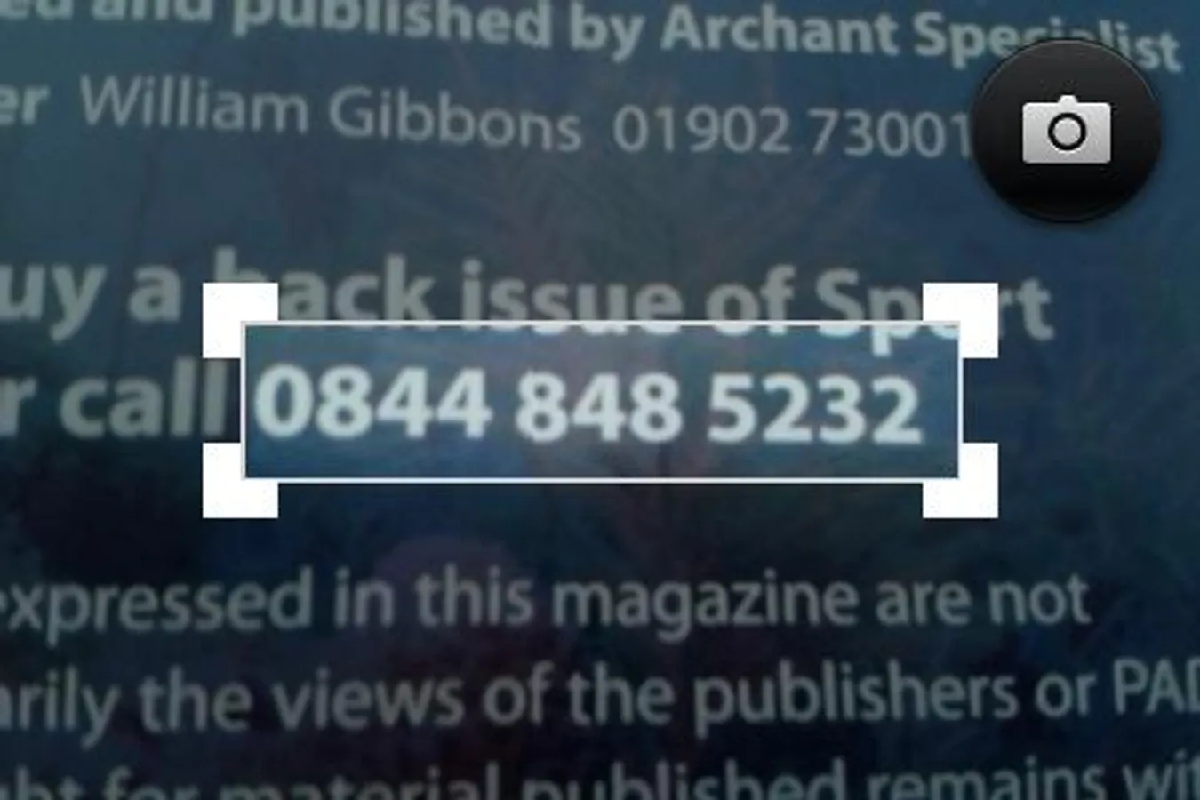 (3) Tap the camera icon to take a picture of the number. Number Scanner will analyse the image you took and recognise and display the number within a few seconds. You can then tap the number to add it to your contacts, make a phone call, or copy it into another application.