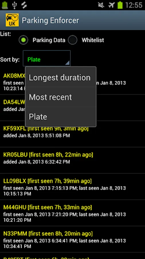 (6) The name of the log and whitelist CSV files can be configured via the 'Settings' menu, and both files are stored on your SD card. To display or edit those logs using the app, tap the 'Lists...' button or choose 'Manage Lists'. The list of vehicle registration codes can be sorted and displayed using different criteria.