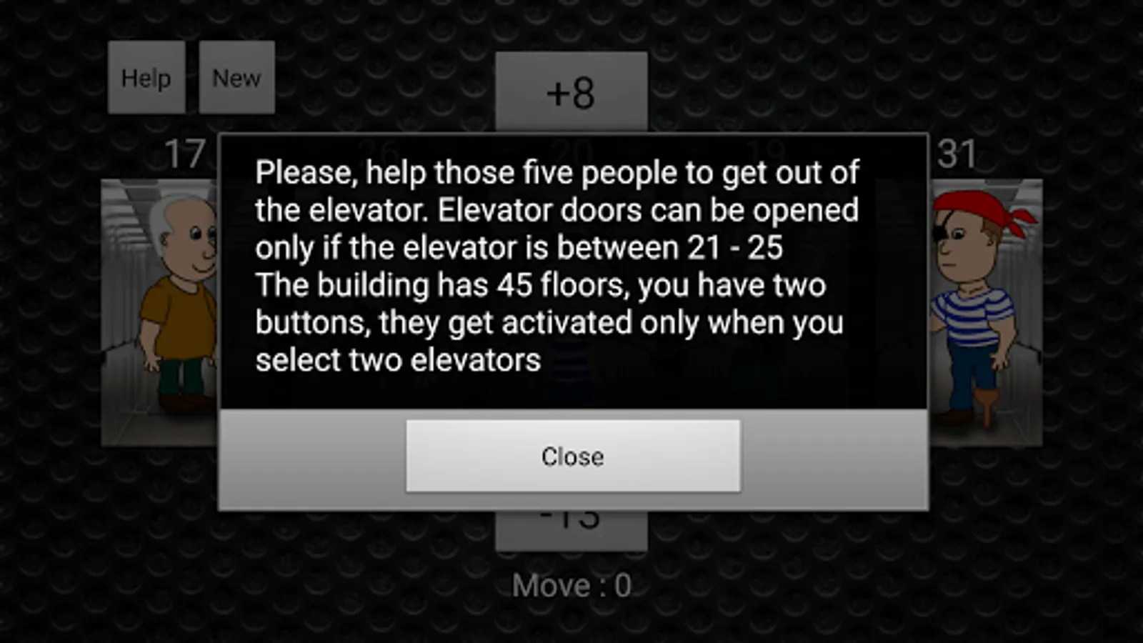Please, help those five people to get out of the elevator. Elevator doors can be opened only if the elevator is between 21 - 25 nThe building has 45 floors, you have two buttons, they get activated only when you select two elevators