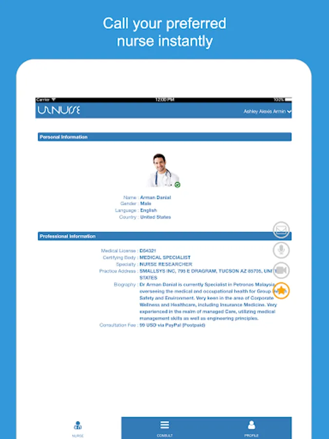 Consumers connect to nurses in realtime worldwide to instantly teleConsult online or makes an Online Appointment. Easy for Consumer to seek professional nursing services from a qualified nurse from anywhere in the world. Logs and archives as options for the session and help with payments and new services. TeleNursing fees determined by the u2Nurse registered nurse.