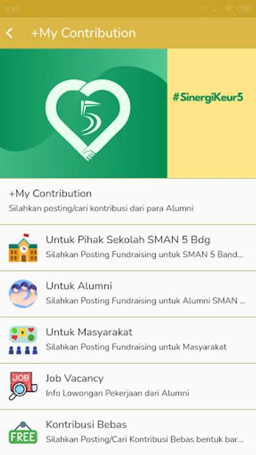 - My Contribution (untuk SMAN 5 Bandung, untuk Alumni, untuk Masyarakat).