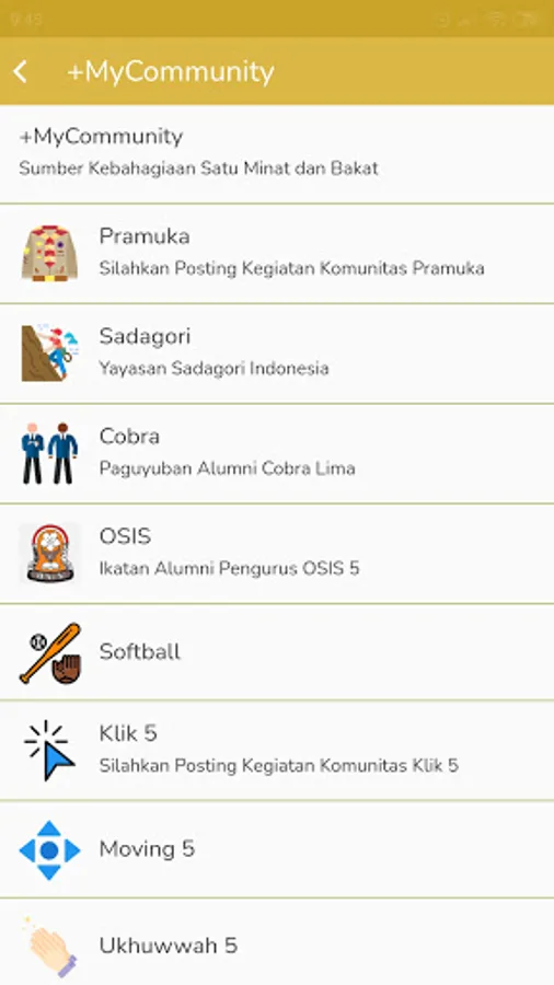 - My Community (Komunitas IA5, seperti; Sadagori Academy, Klik5, Pramuka, IAPO5, Moving5, Tenis5, Ukhuwah5, Softball5, Basket5, Kobra5, LD5, Komunitas budaya5 dll.)