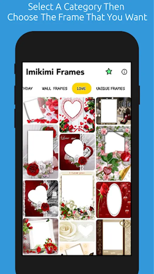 Our frames and effects library is always expanding and every week you can find something new. In this app, you can find frames on different categories such us Imikimi photo frame birthday (imikimi happy birthday frames), imikimi Christmas frames, imikimi love frames, and best collections of Wall, Beach, Romantic and Valentine photo frames for your creations.