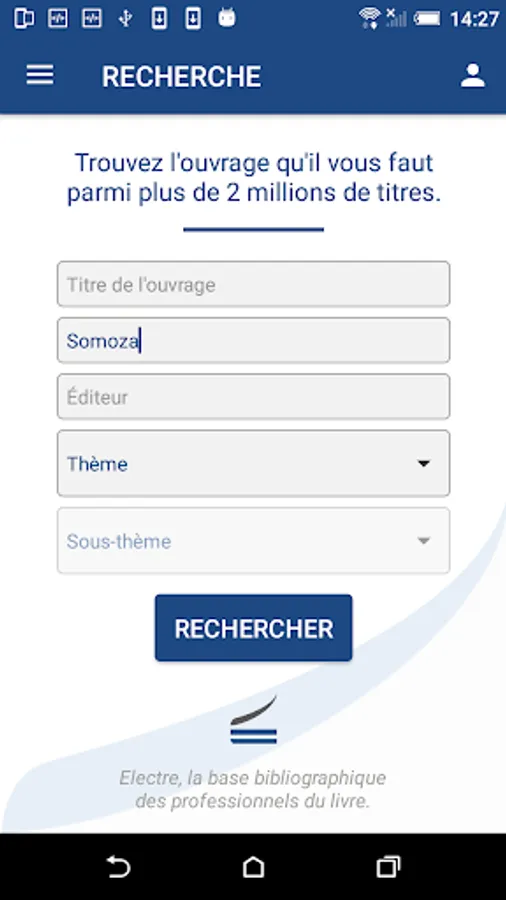 • The search for books in the Electre.com professional bibliographic database, among more than 2.1 million paper or digital works, referenced since 1984. This database, enriched daily, ensures the best completeness and relevance of results for any bibliographic research for book professionals: librarians, booksellers, documentalists, publishers ...