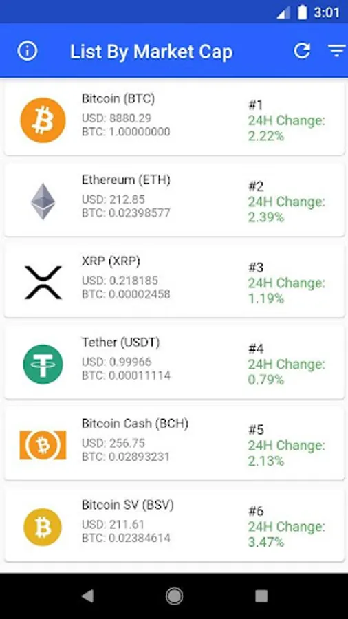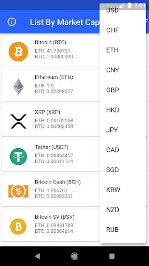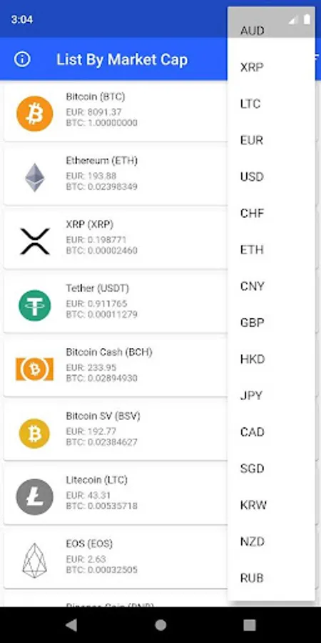 Listed by market cap, you can see the latest price movements in your preferred currency, including: AUD, CAD, CHF, CNY, ETH, EUR, GPB, HKD, INR, JPY, KRW, LTC ,NZD, RUB, SGD, USD, and XRP.
