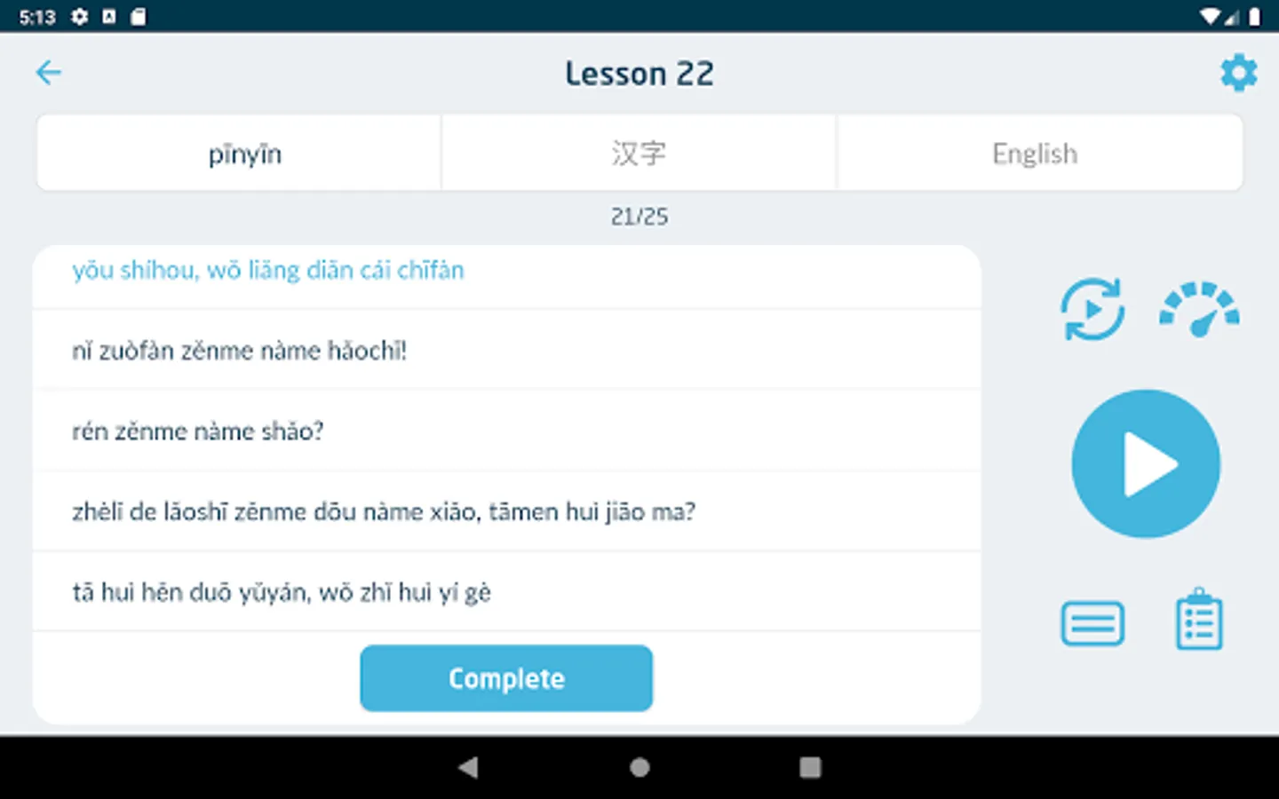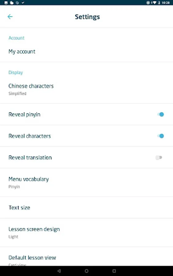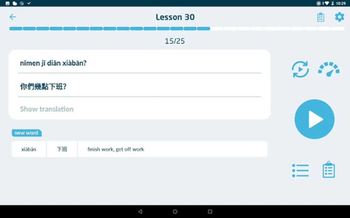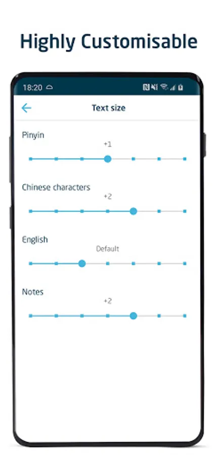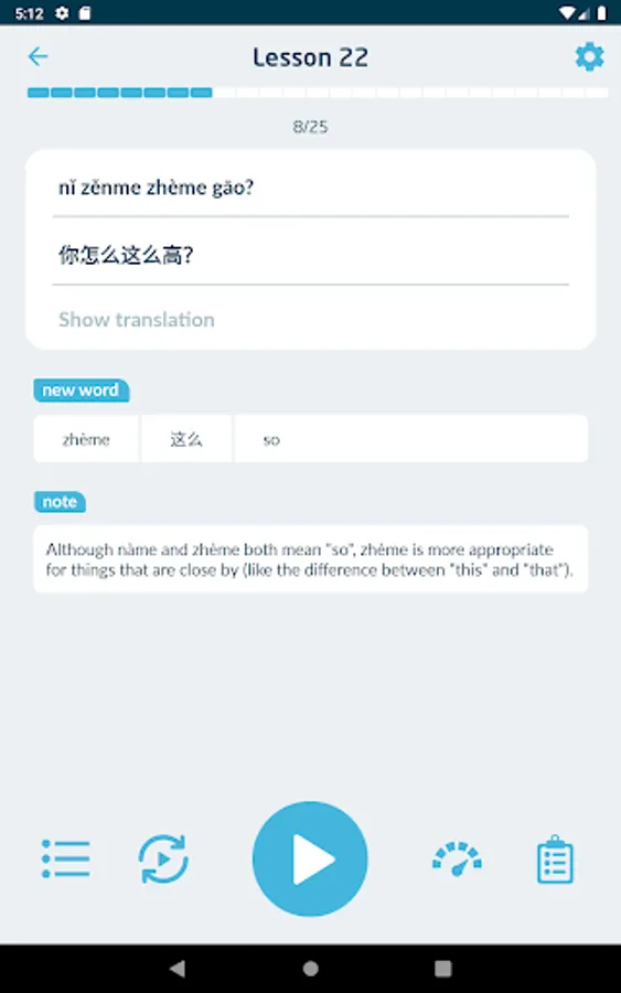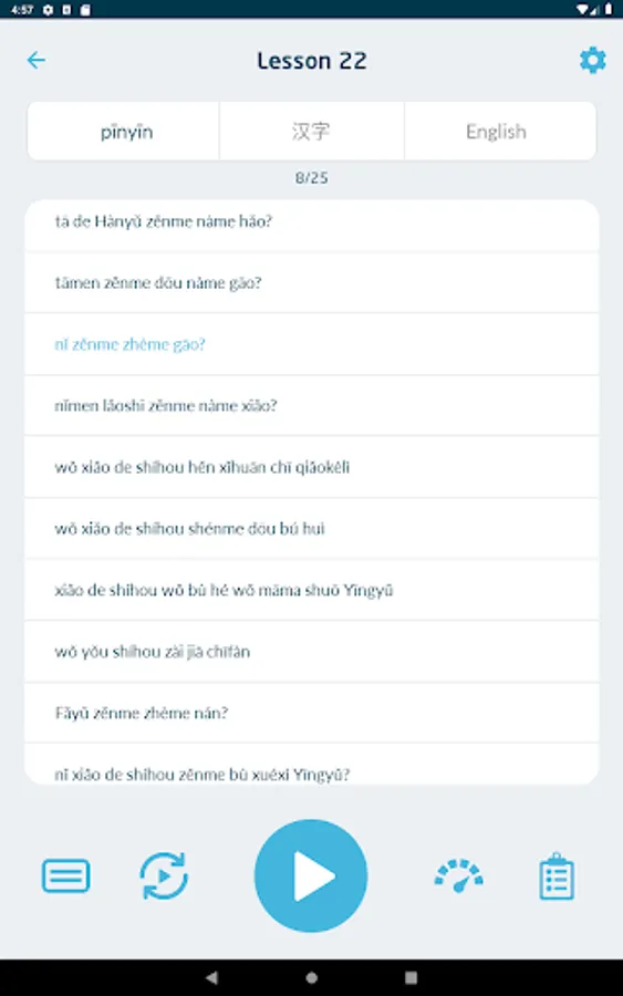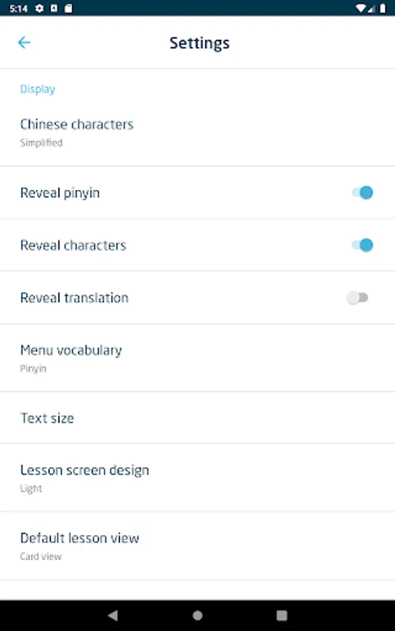 • Each line of text (translation, pinyin or Chinese characters) can be individually revealed and hidden.