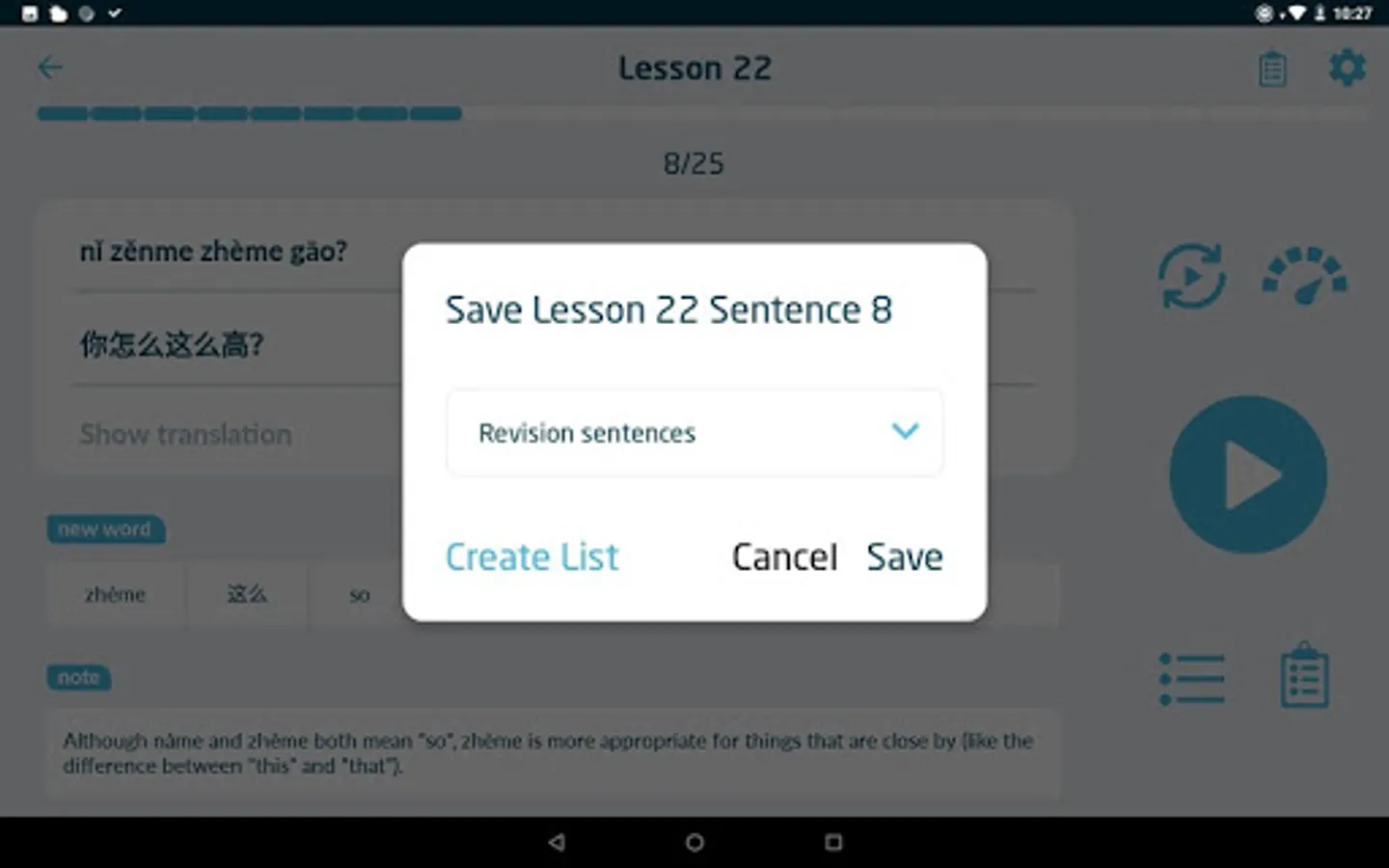 • Save custom lists of vocabulary and sentences and generate study sessions from them.
