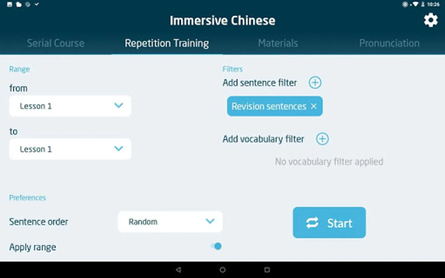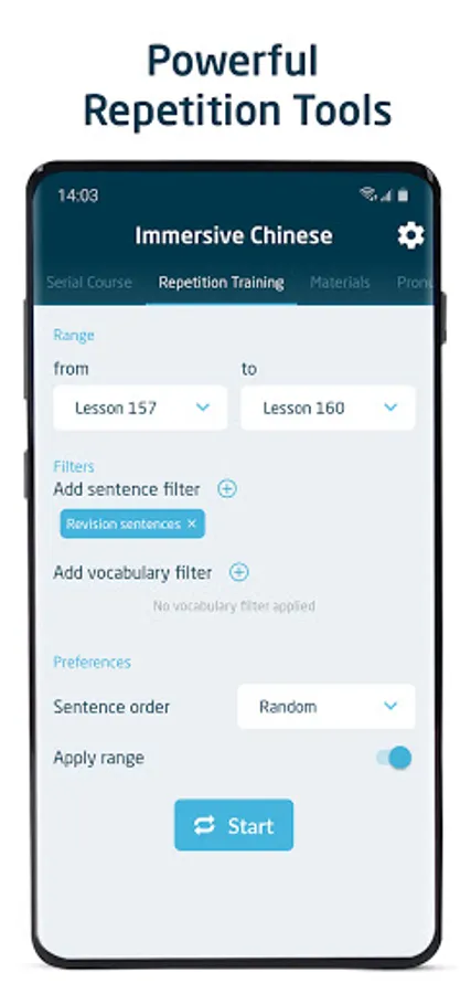 Research into language acquisition has shown that repetition of comprehensible content is one of the most effective ways of learning a language. Repetition Training is a core feature of Immersive Chinese that allows you to play a specific selection of content on a continuous loop according to a number of different settings. You can set the specific time delay before and after each sentence, use normal speed or slow recordings, repeat each sentence a certain number of times, and use a random or sequential order. You can also add custom filters, so you only study the exact material you want to.