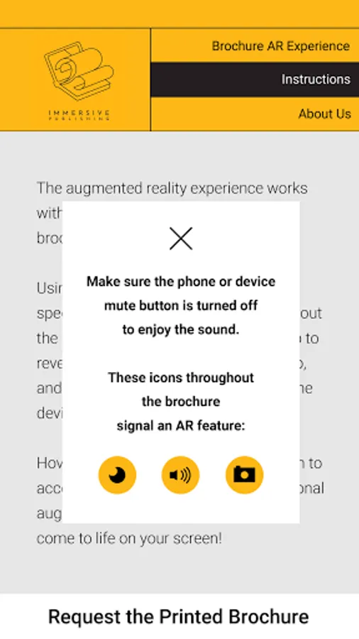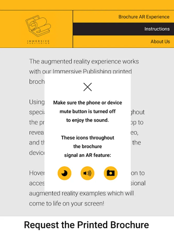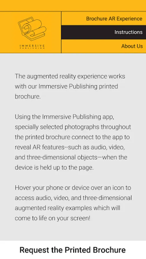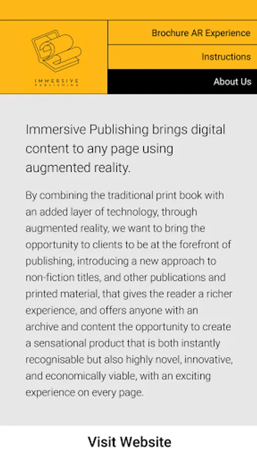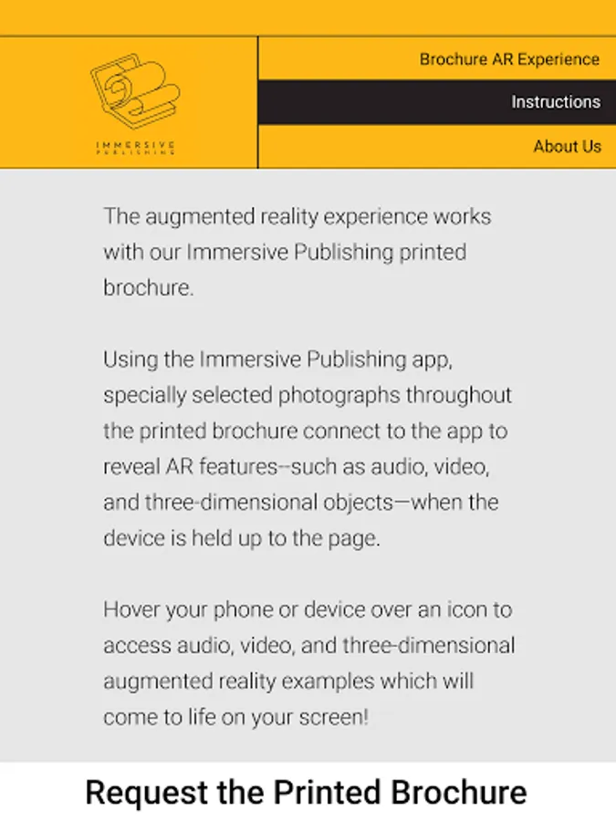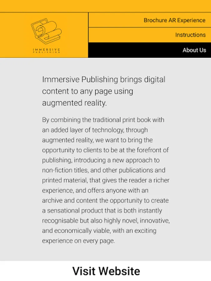 Immersive Publishing combines the printed page with augmented reality, offering solutions which will allow your customers to enjoy digital content in a new manner. This app works with our printed brochure to show you some of things that AR could do for you. Visit www.immersivepub.com for more information or to request a free brochure.