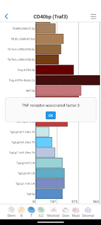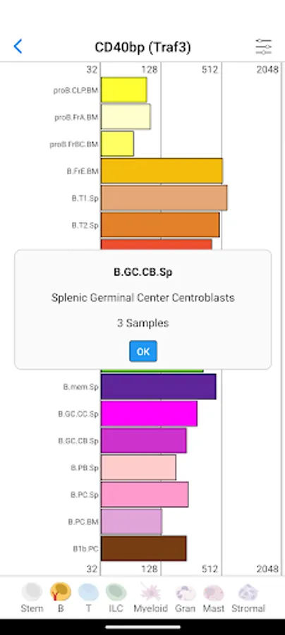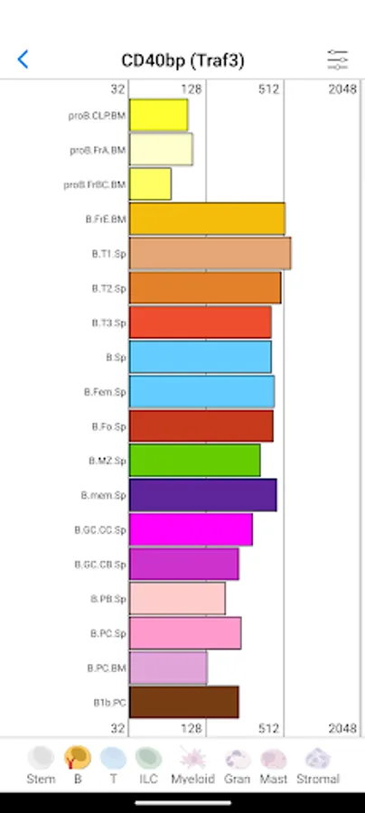 Explore gene expression levels in different mouse immune system cells. Start by entering a gene name (or alias) in the search bar to see a list of hits you can swipe through.