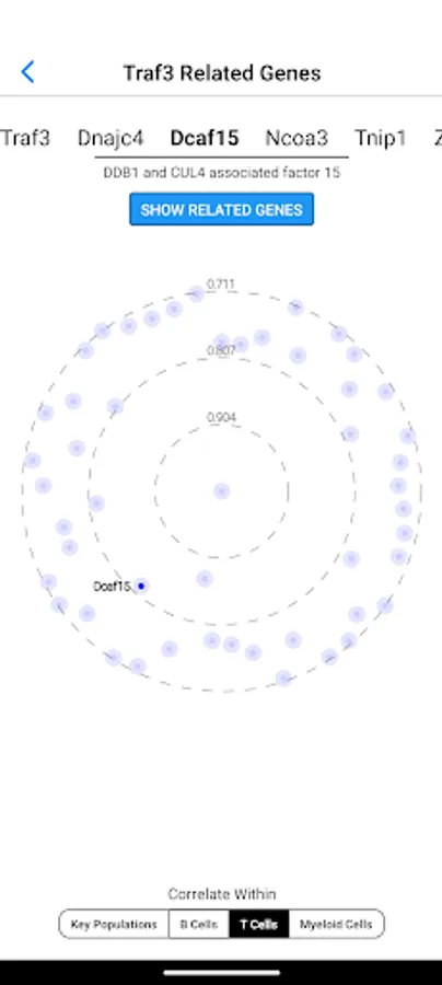 Back on the main "heatmap barcode" screen, if you instead press the "Show related genes" button, you'll see a "gene constellation" view. This shows its most correlated genes within certain population groups. By default, correlation is shown with respect to key populations — these are key populations across the entire immune system.