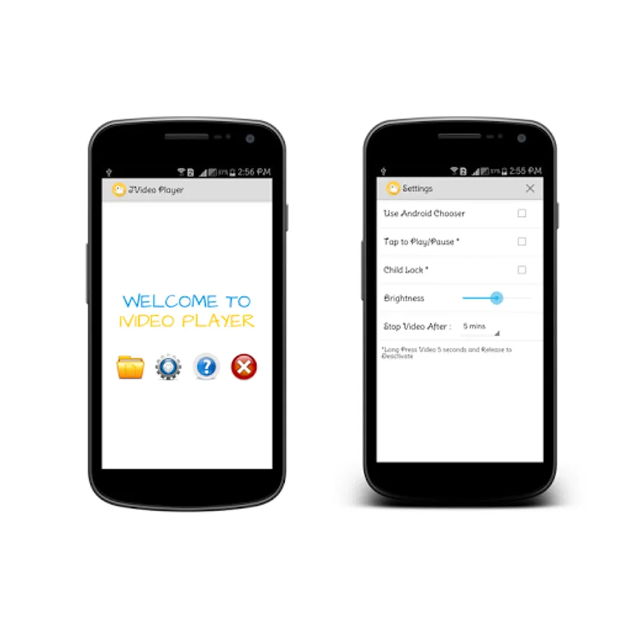 -Settings added: Toggle video chooser mode, Tap to Play/Pause, Child Lock, Brightness, Stop Timer.